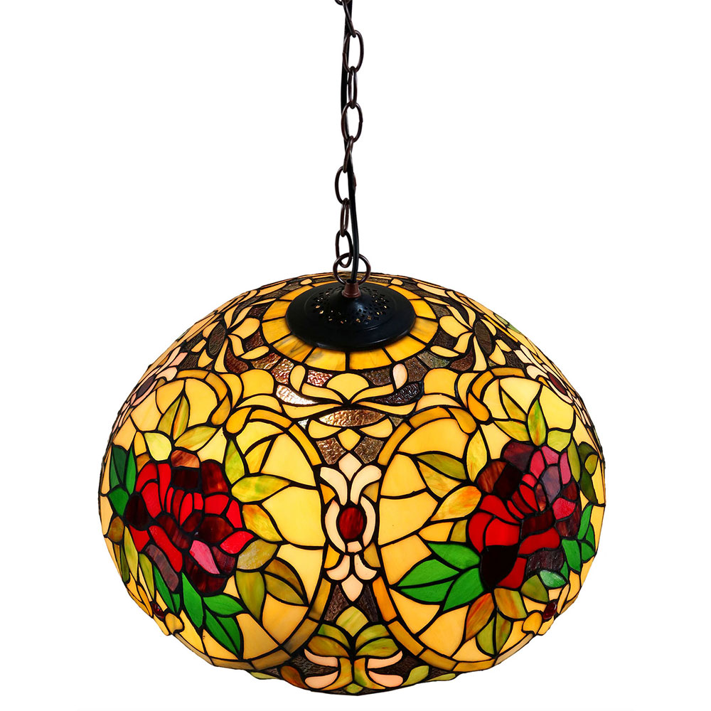 The Red Camellia pendant is a colourful Tiffany style lamp that combines many pieces of art glass to create a stunning and complex design.