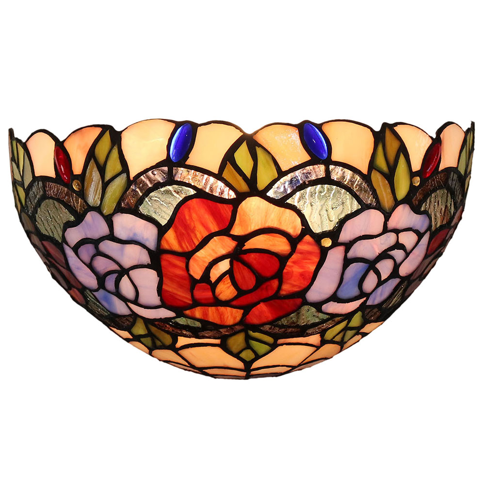 This beautiful wall lamp features a handcrafted, genuine rose design on stained art glass shade which will brighten up and inspire your space with natural elements.