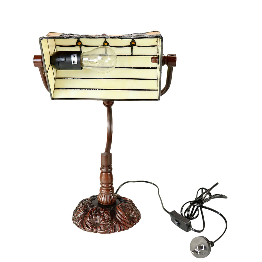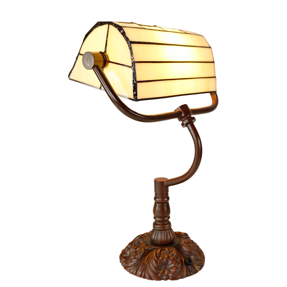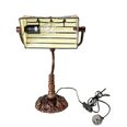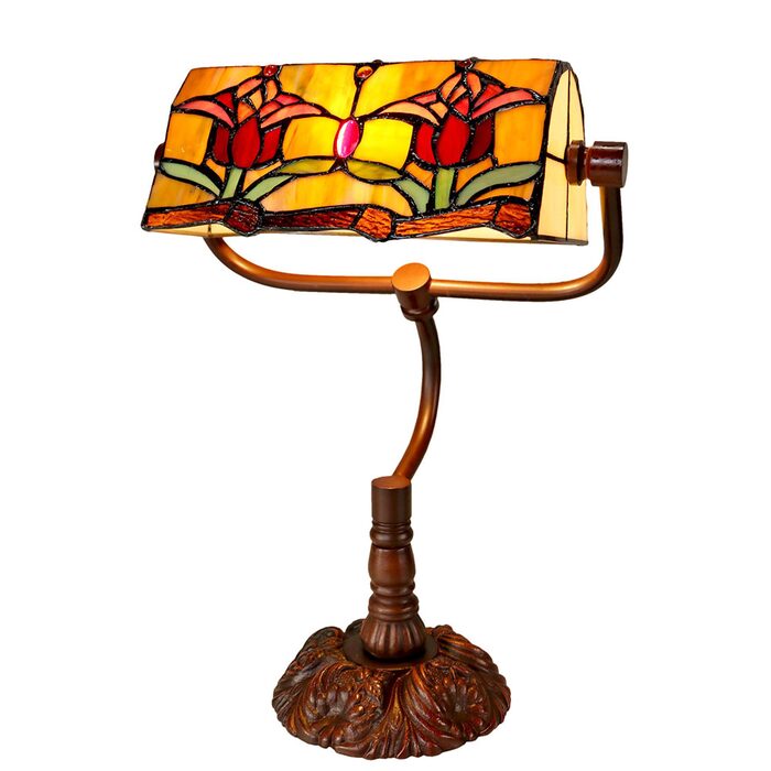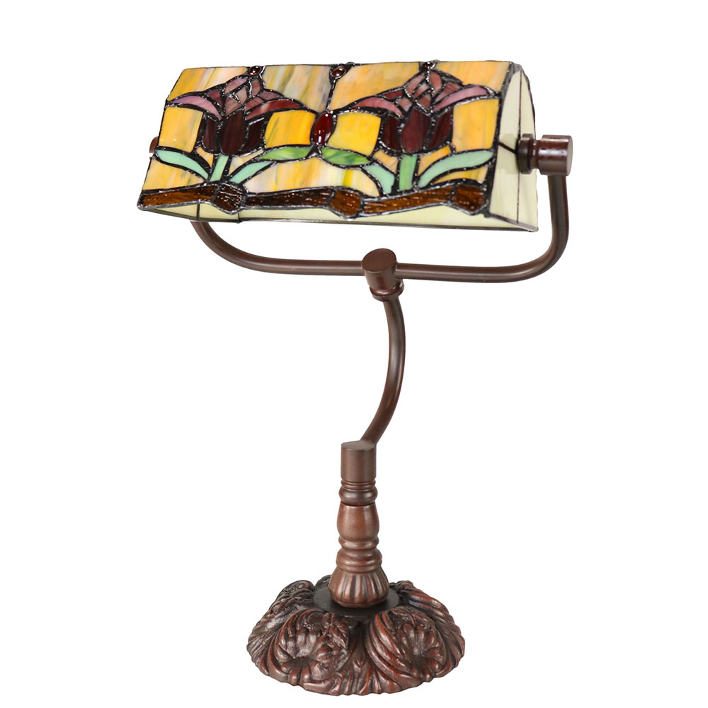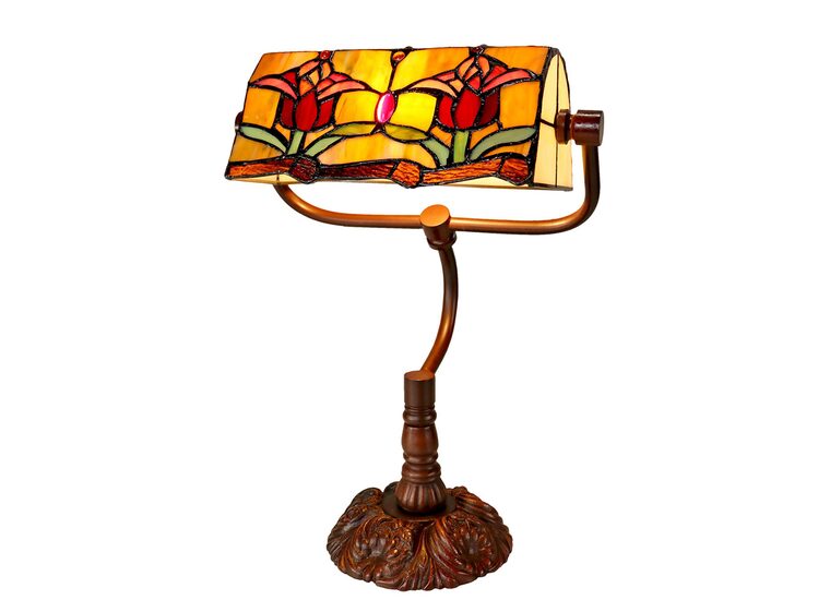 This beautiful table lamp features a handcrafted, genuine red tulip design on stained art glass shade combined with the traditional banker lamp shape, carved in a traditional design with a dark neutral colour to juxtapose the lively art glass shade for maximum impact.