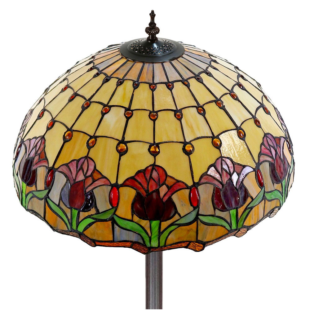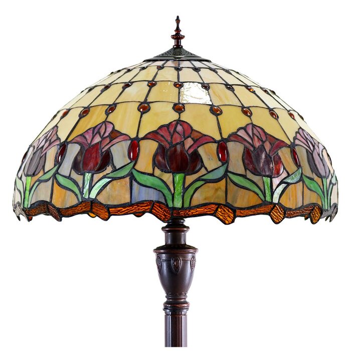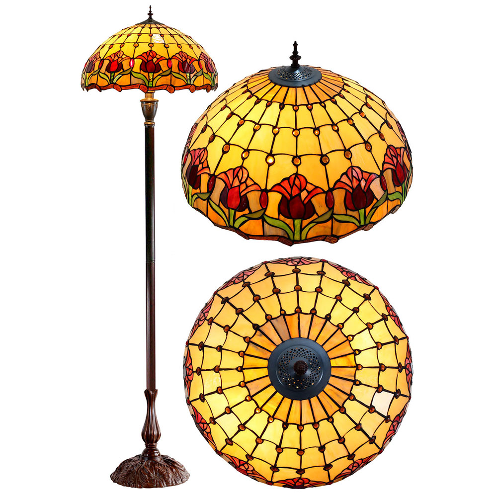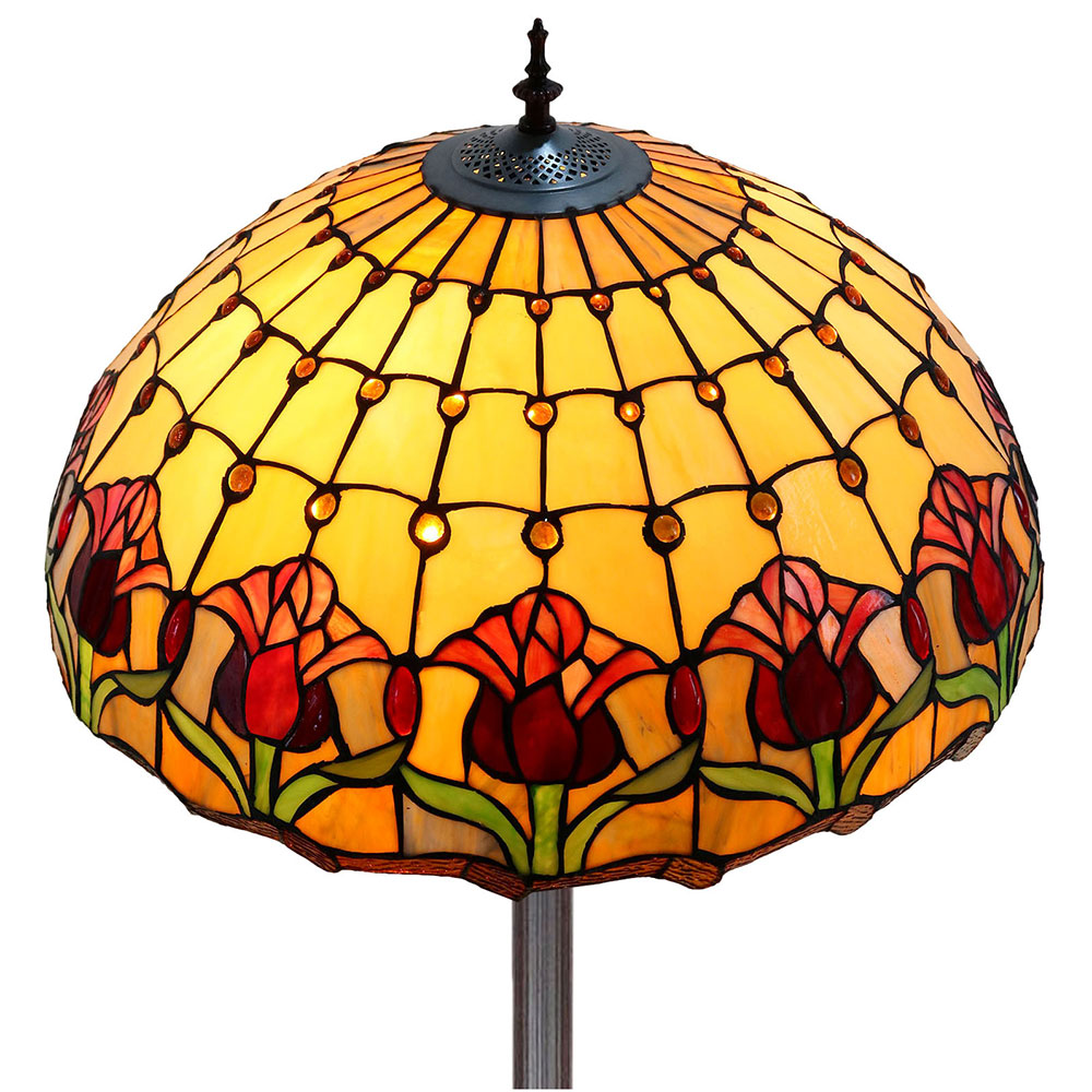This beautiful floor lamp features a handcrafted, genuine red tulip design on stained art glass shade combined with beautiful base and frame made of resin.