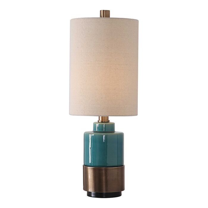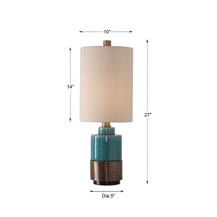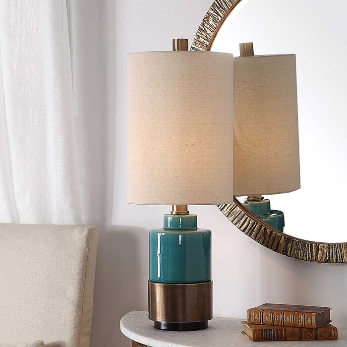 Add a bright pop of color to any space with this modern table lamp design that features a sleek ceramic column that's finished in a bright turquoise glaze, displayed on a plated antique brass foot.