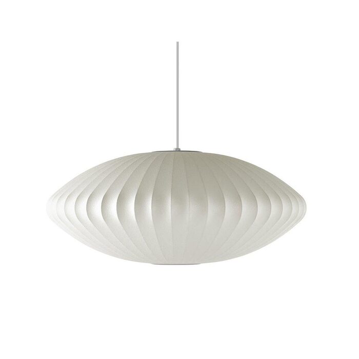 A stylish 1 light indoor ceiling pendant perfect for any room. The Replica George Nelson Saucer Shape Bubble Pendent Light modern pendant by Modern Lights will complement your room without competing with it. White fabric shade with Nickel metal frame and white adjustable cable.