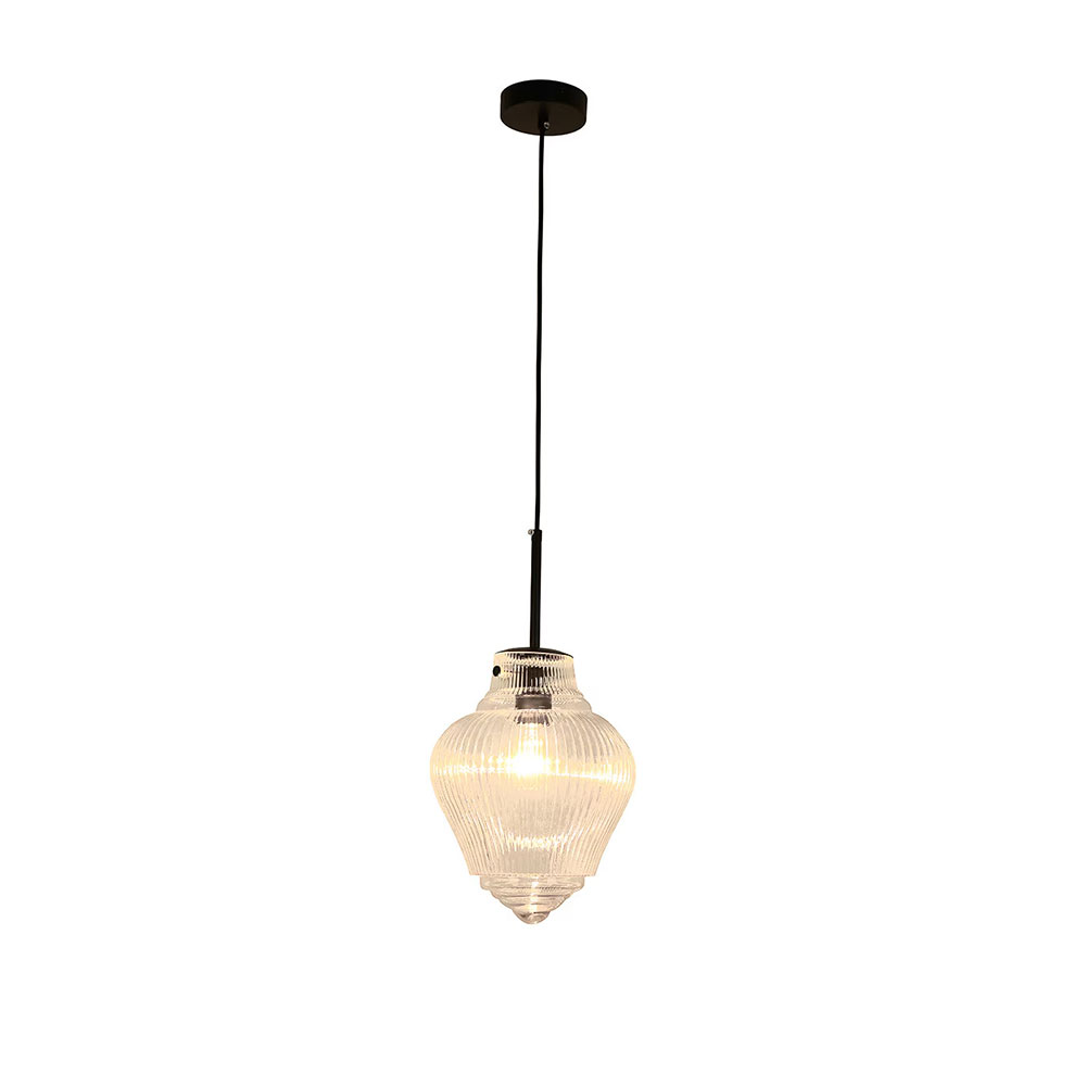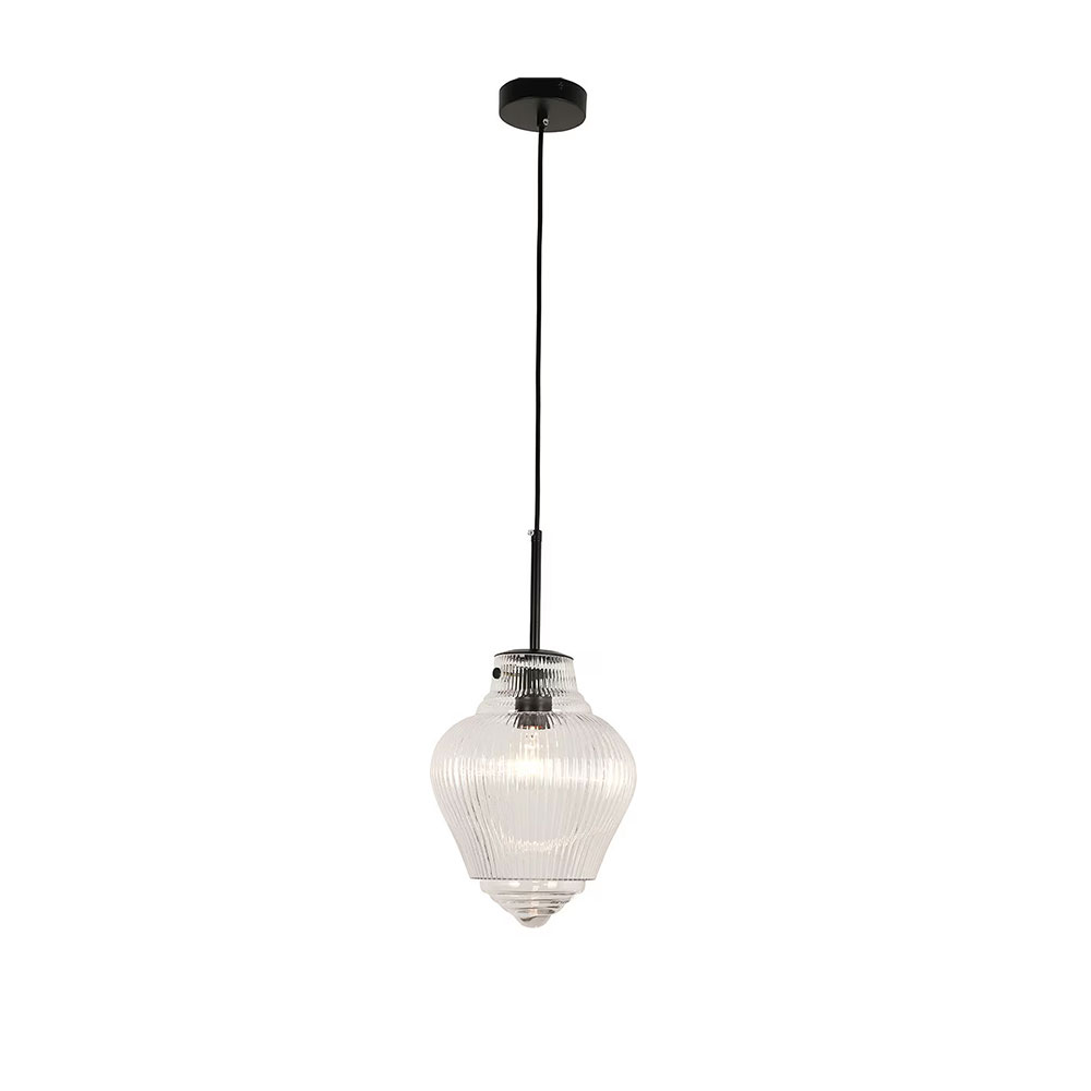 Featuring an elongated clear ribbed glass shade, this pendant introduces texture and subtle visual interest while maintaining a clean, streamlined look.