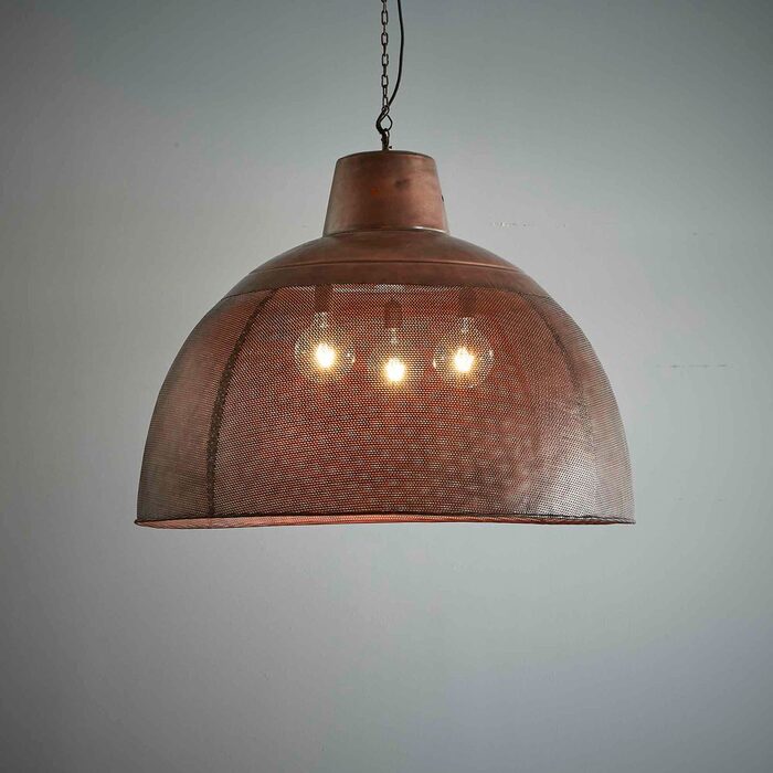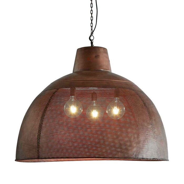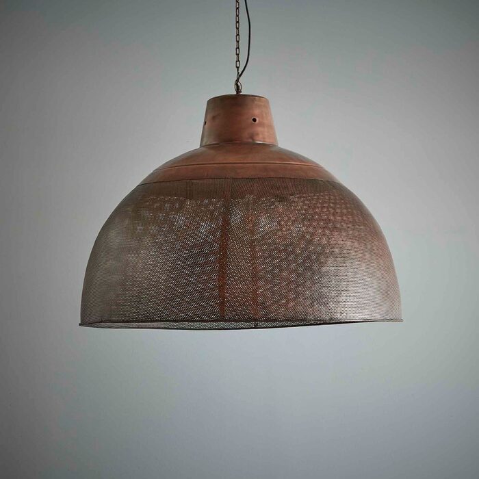 A rustic perforated pendant light with an industrial feel. This pendant is designed to patina over time for a vintage aesthetic.