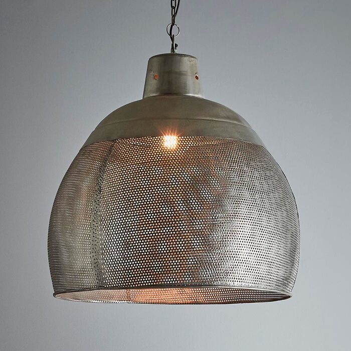 A rustic perforated pendant light with an industrial feel. This pendant is designed to patina over time for a vintage aesthetic.