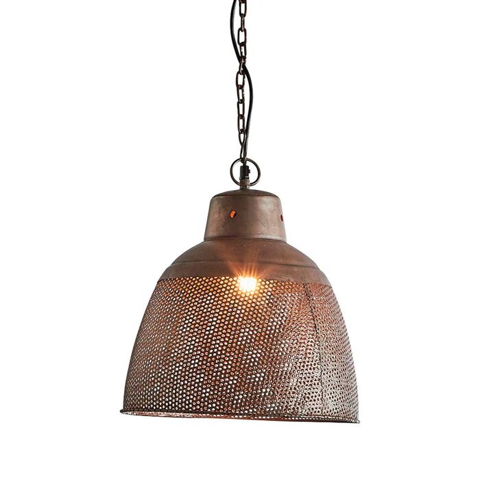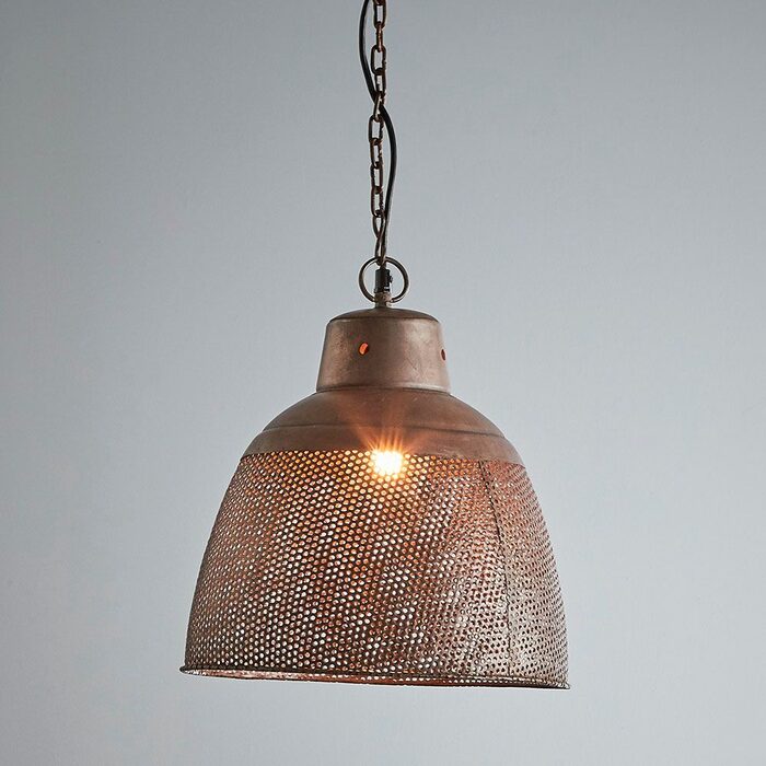 A rustic perforated pendant light with an industrial feel. This pendant is designed to patina over time for a vintage aesthetic.