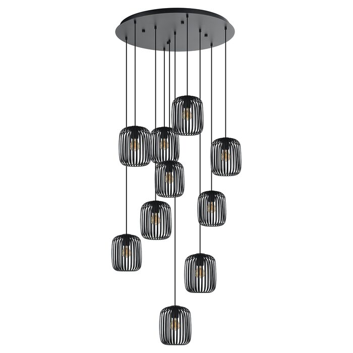 Add modern style to your home with this striking pendant light, featuring a large, caged lampshade with a sandy or black coloured steel finish and with a textile cable.