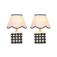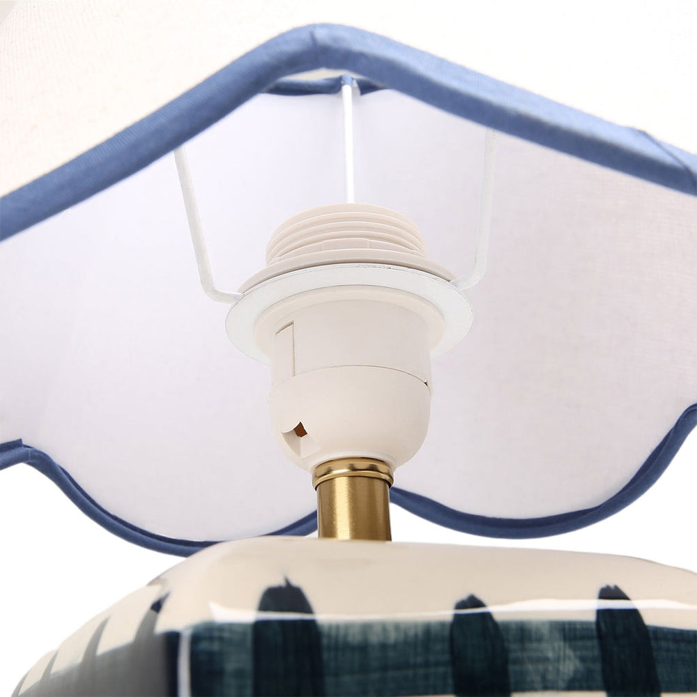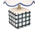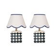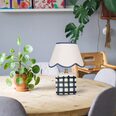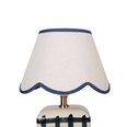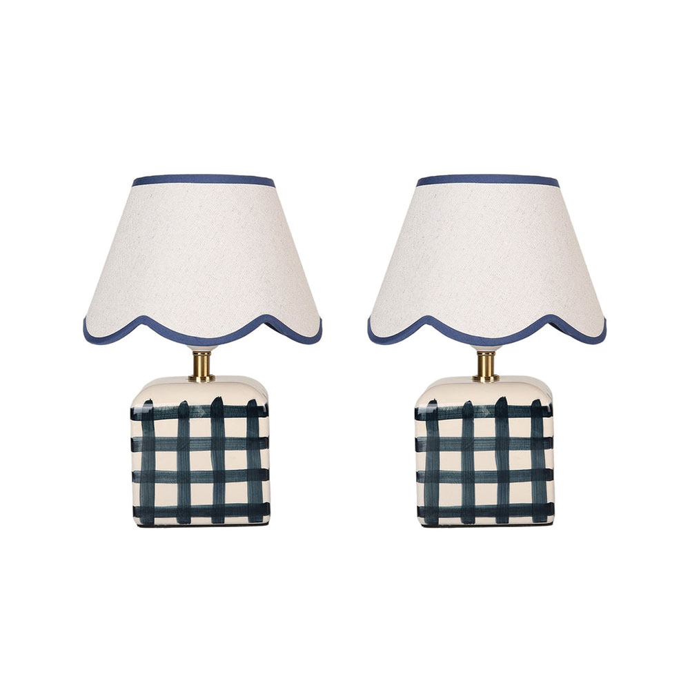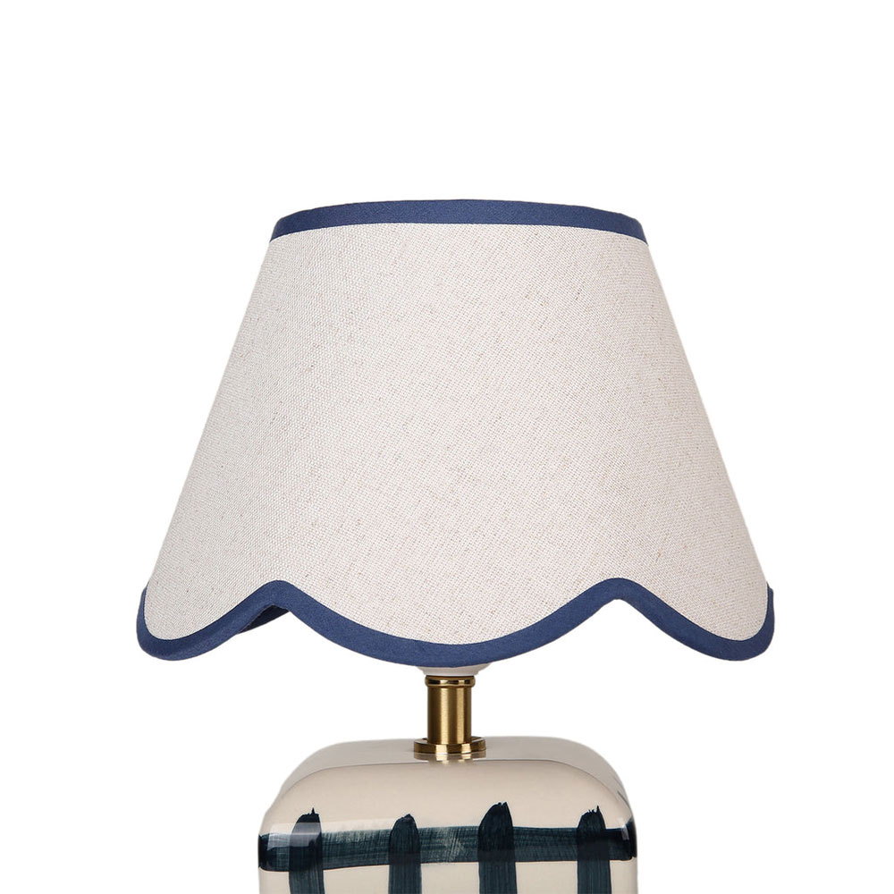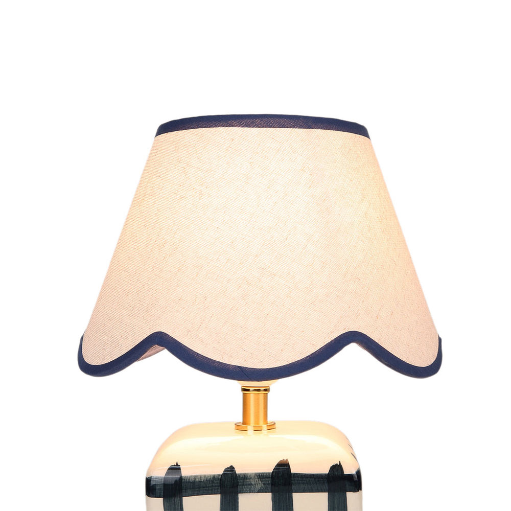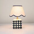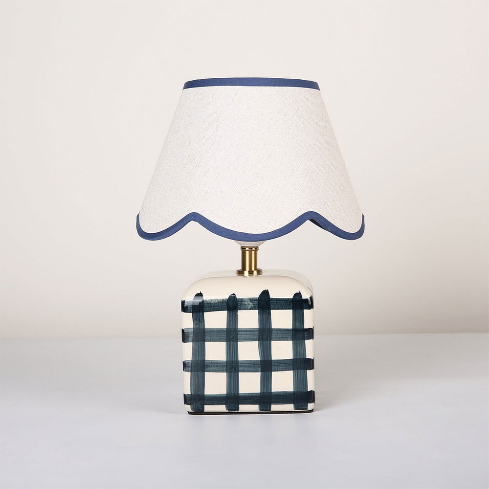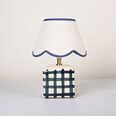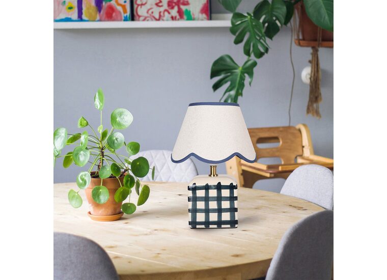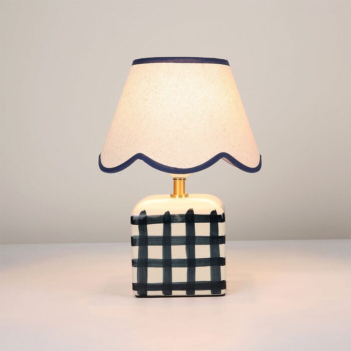 It's designed with a scallop-edged shade and a checked base.