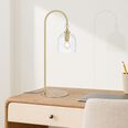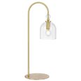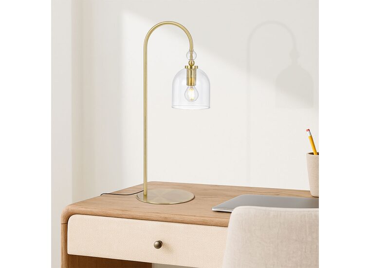 Featuring a floor lamp, table lamp, and pendant light, each piece is crafted from iron and topped with a clear glass dome shade.
