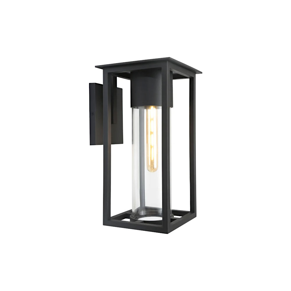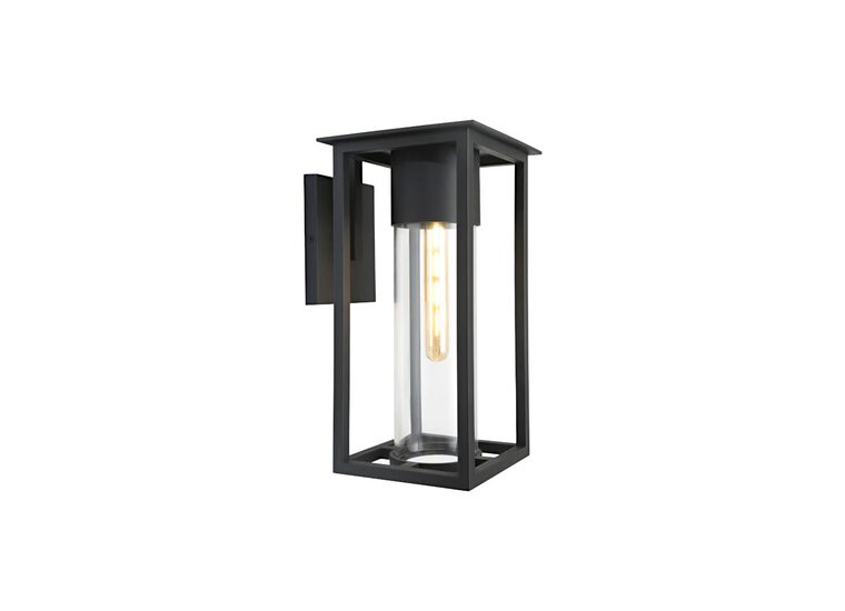 The Ryde Exterior Wall Light in Black and Clear by Cougar Lighting features a stylish circular design with a clear glass shade for bright, focused illumination.
