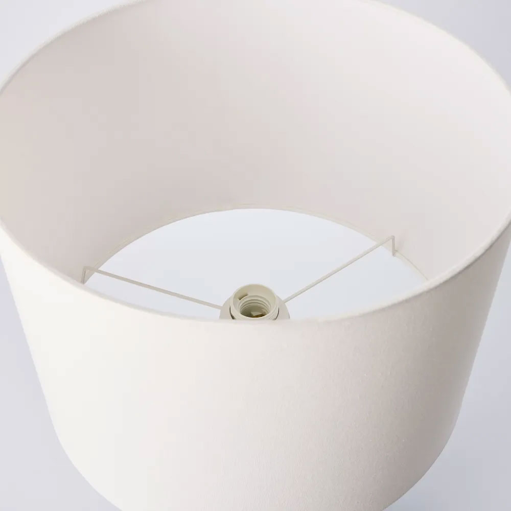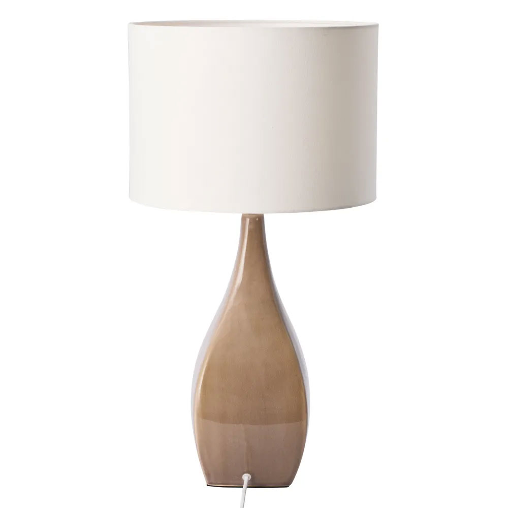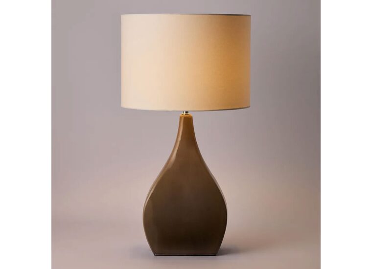 Its sculptural ceramic base, finished in a soft, earthy glaze, is paired with an ivory faux linen drum shade to create a gentle ambient glow.