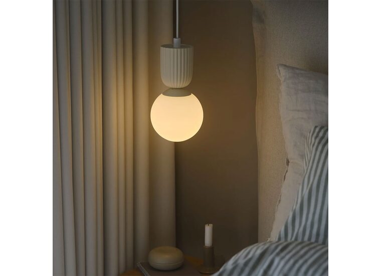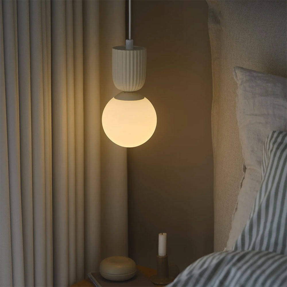 Sadie has an organic and harmonic shape where the large opal glass dome complements the light, rippled suspension beautifully.