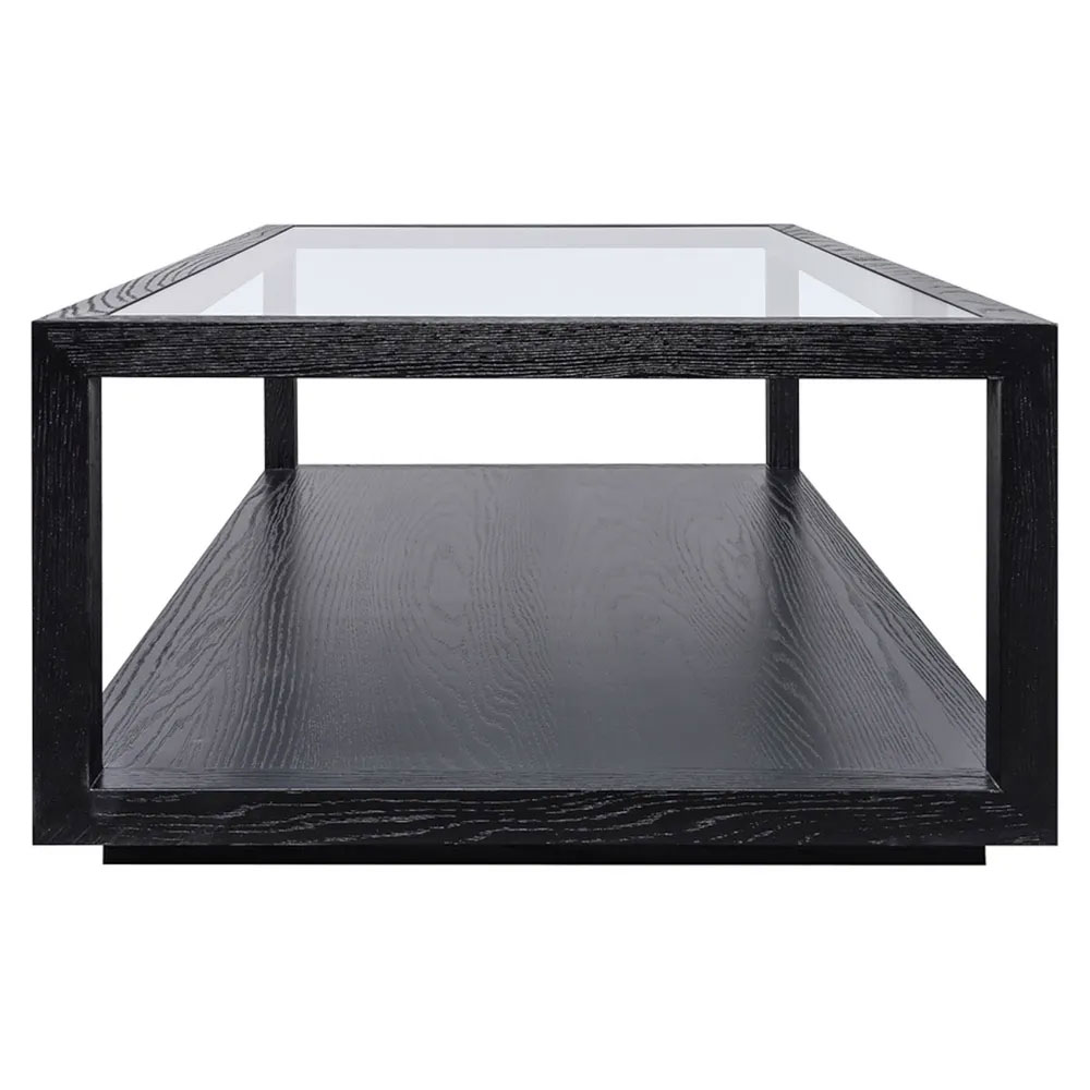 The crystal-clear tempered glass top enhances natural light, creating an open and refined look, while the lower oak shelf offers practical storage or a display surface for curated décor.