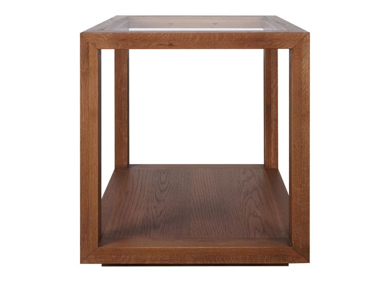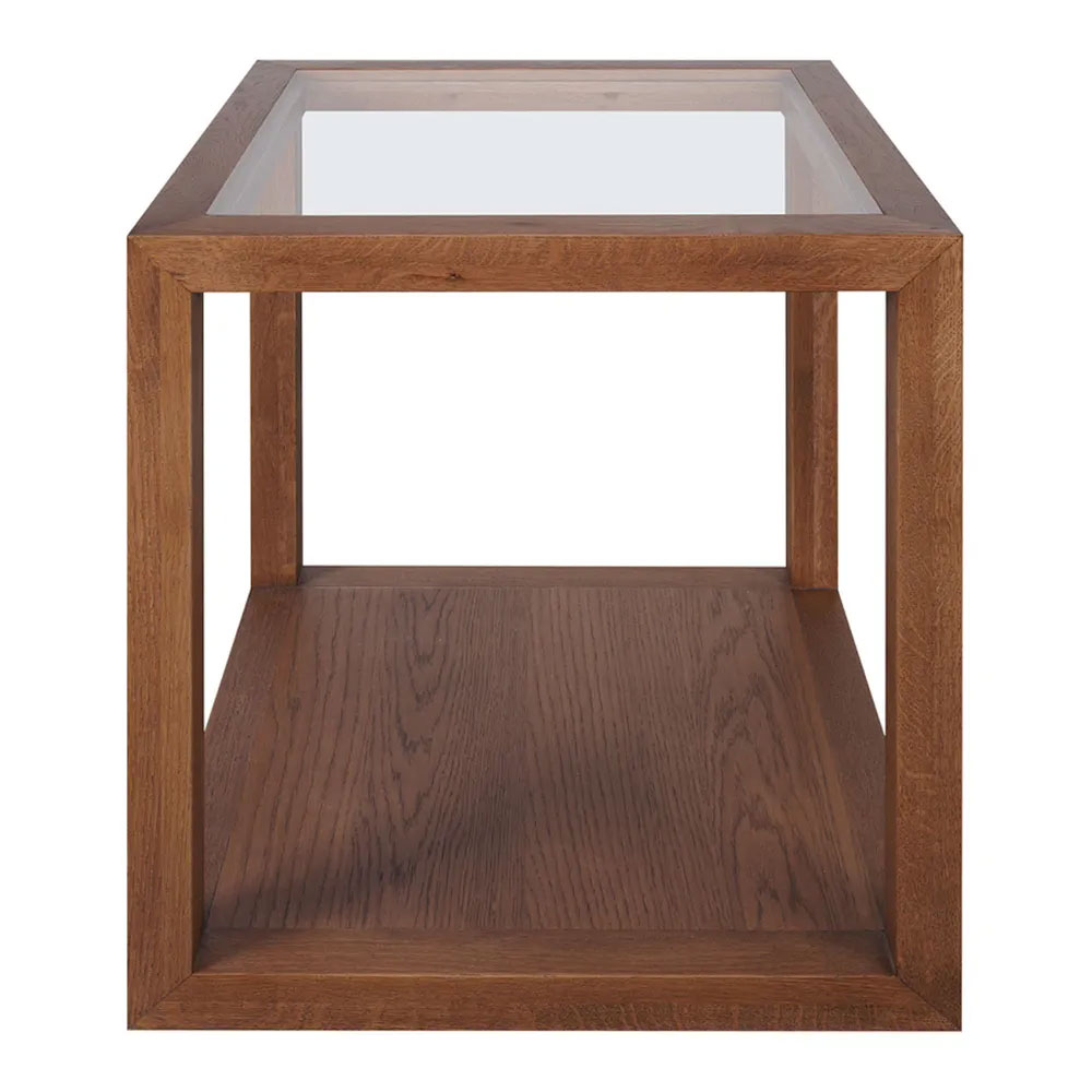 The brushed oak walnut finish introduces a timeless warmth, adding depth and a refined organic touch that complements various décor styles, while the crystal-clear tempered glass top enhances natural light, creating a sense of openness.