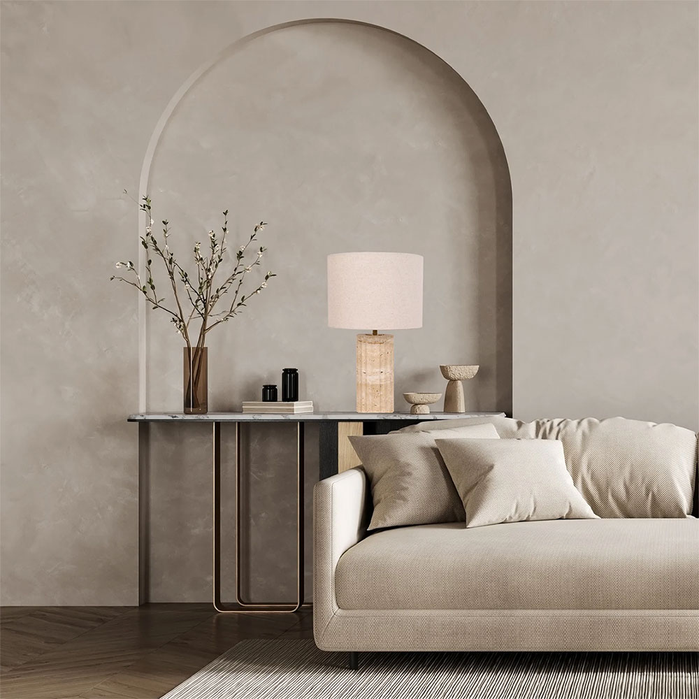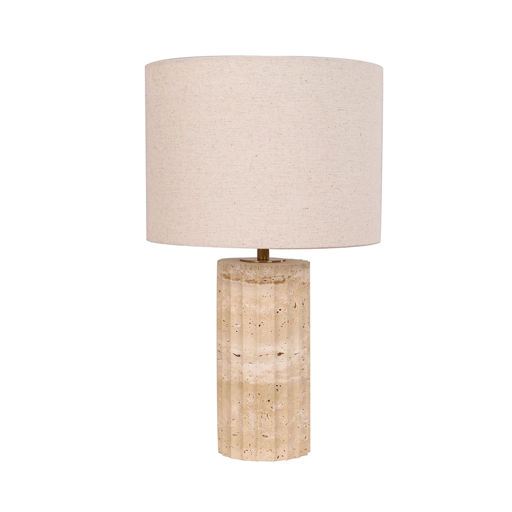 Elevate your space with the understated sophistication of the Sagitta Table Lamp, featuring a beautifully crafted travertine base accented with warm brass detailing.