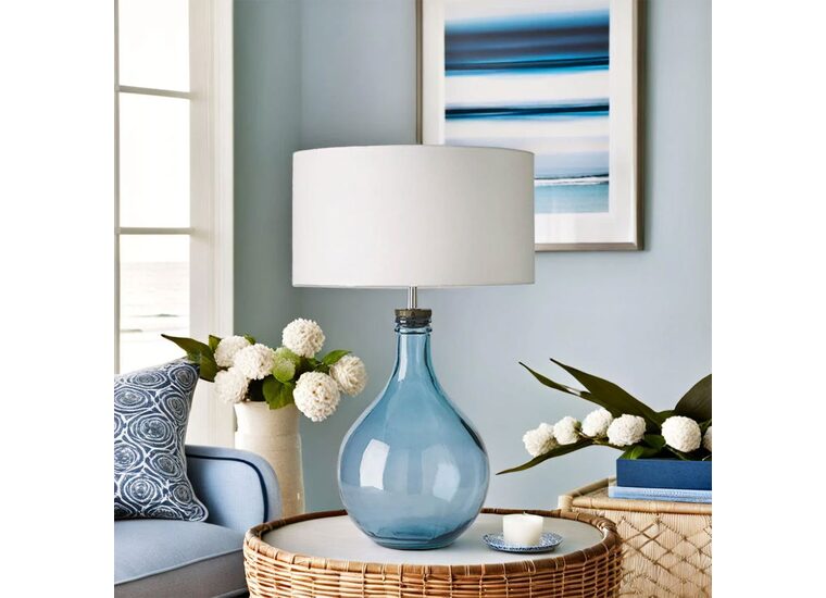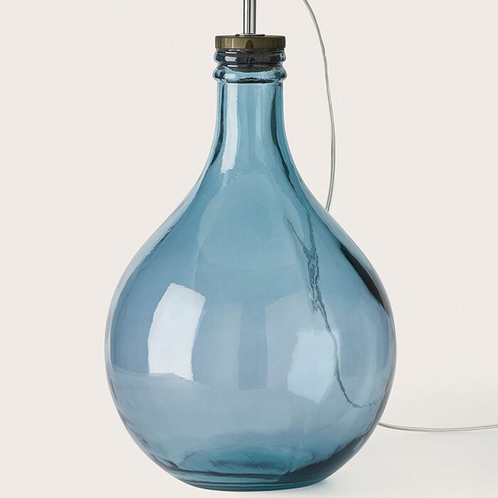 Sam’s glass base features a classic rounded silhouette with an alluring clear blue finish.