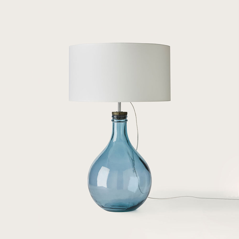 Sam’s glass base features a classic rounded silhouette with an alluring clear blue finish.
