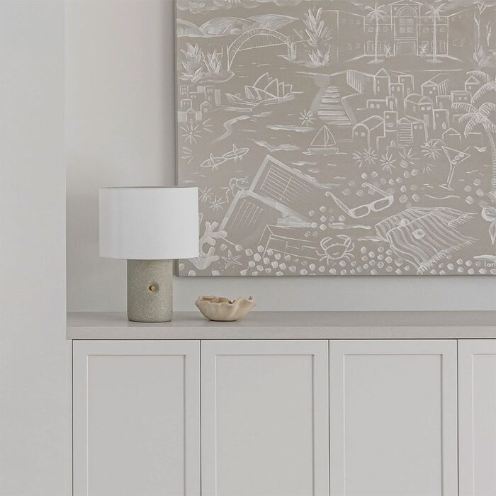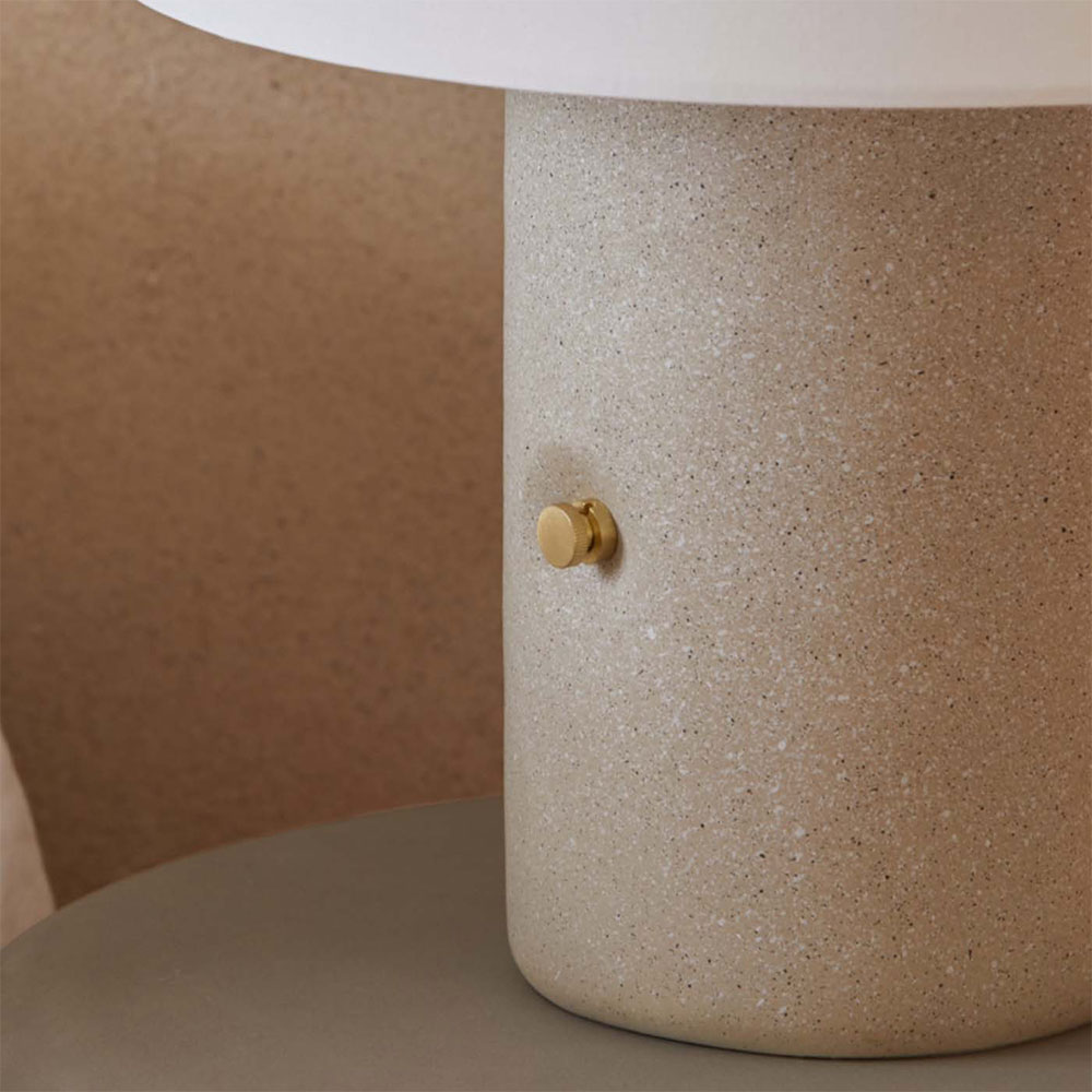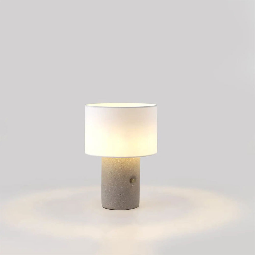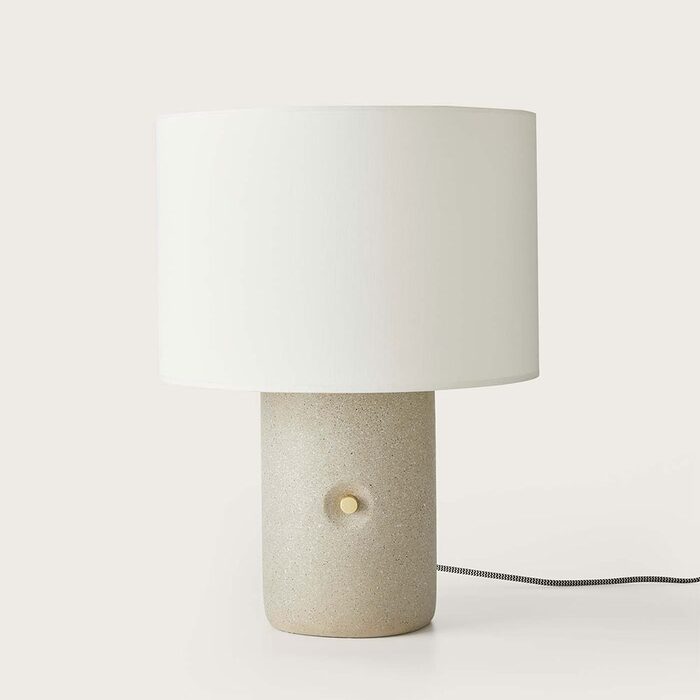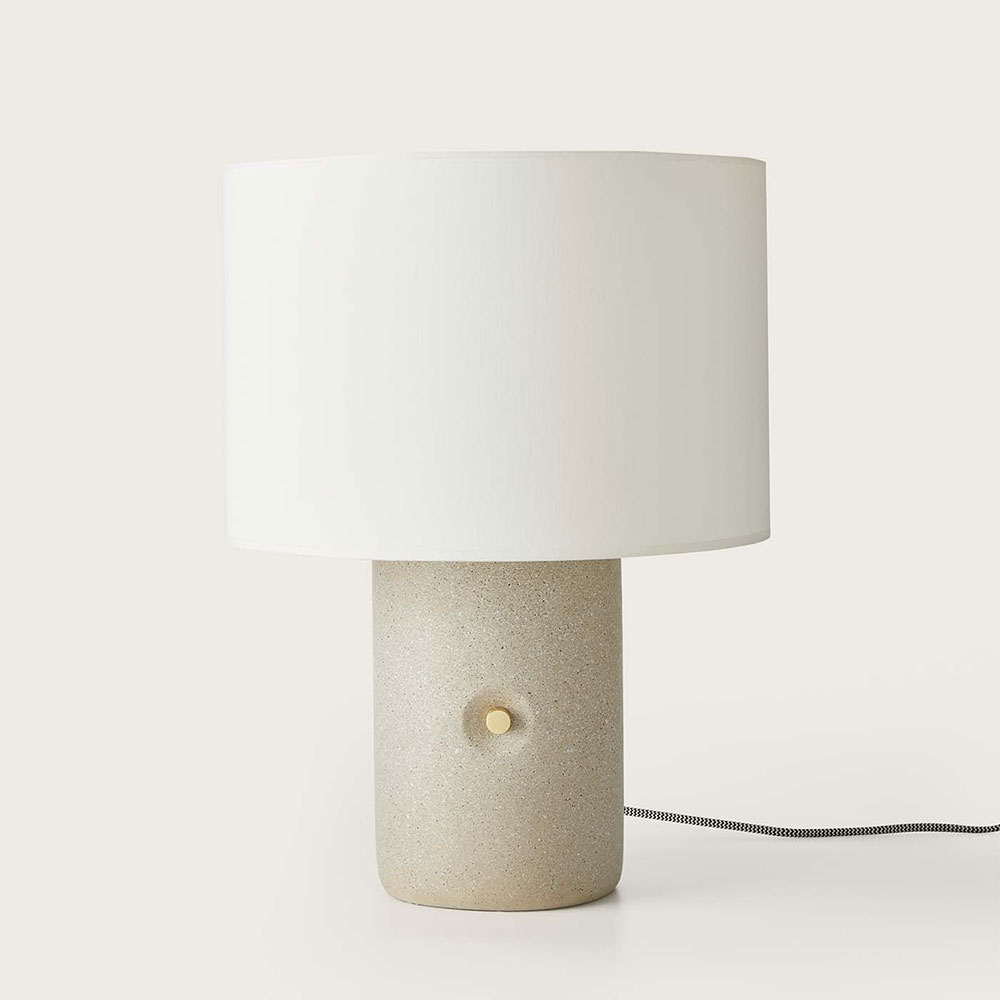 Sand Table Lamp features an attractive grey terrazzo stone base and creates a subtle contrast to the simple white shade above.