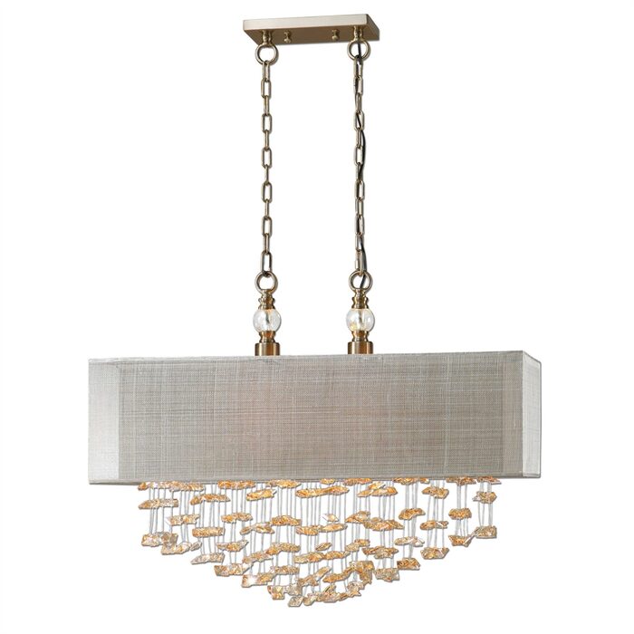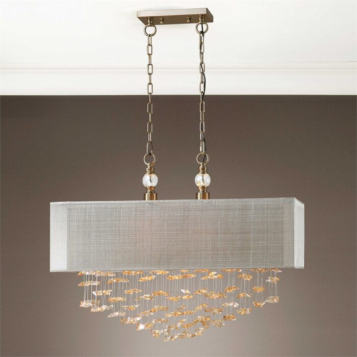 Champagne drop crystals are a brilliant focal point for this sophisticated transitional fixture. Featuring double nested shades yielding both tone and texture.
