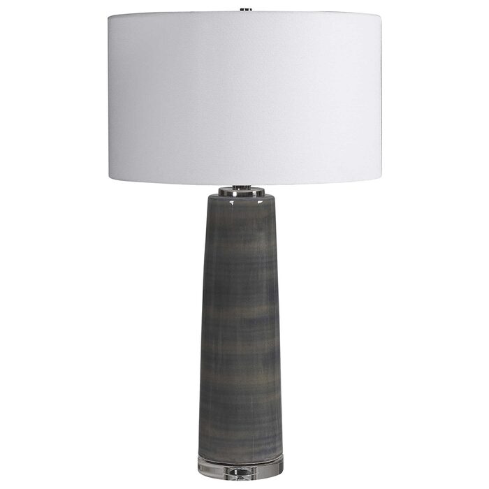 Simple and contemporary, this ceramic table lamp showcases a subtle striped charcoal gray glaze, accented with polished nickel plated details and a thick crystal foot.