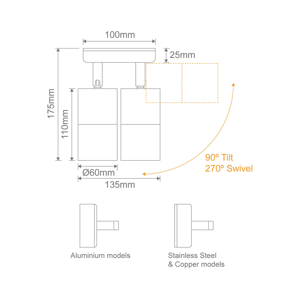 Available in solid finishes (316 Stainless Steel and Copper), Anodised Titanium Silver Aluminium and Powder coated Aluminium (Textured Black and White). Suits a GU10 lamp.