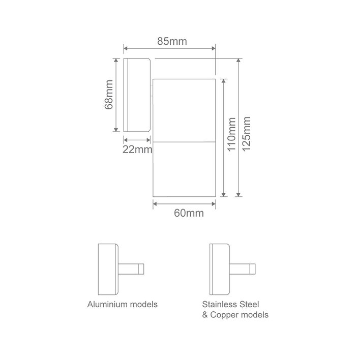 Available in solid finishes (316 Stainless Steel and Copper), Anodised Titanium Silver Aluminium and Powder coated Aluminium (Textured Black and White).