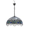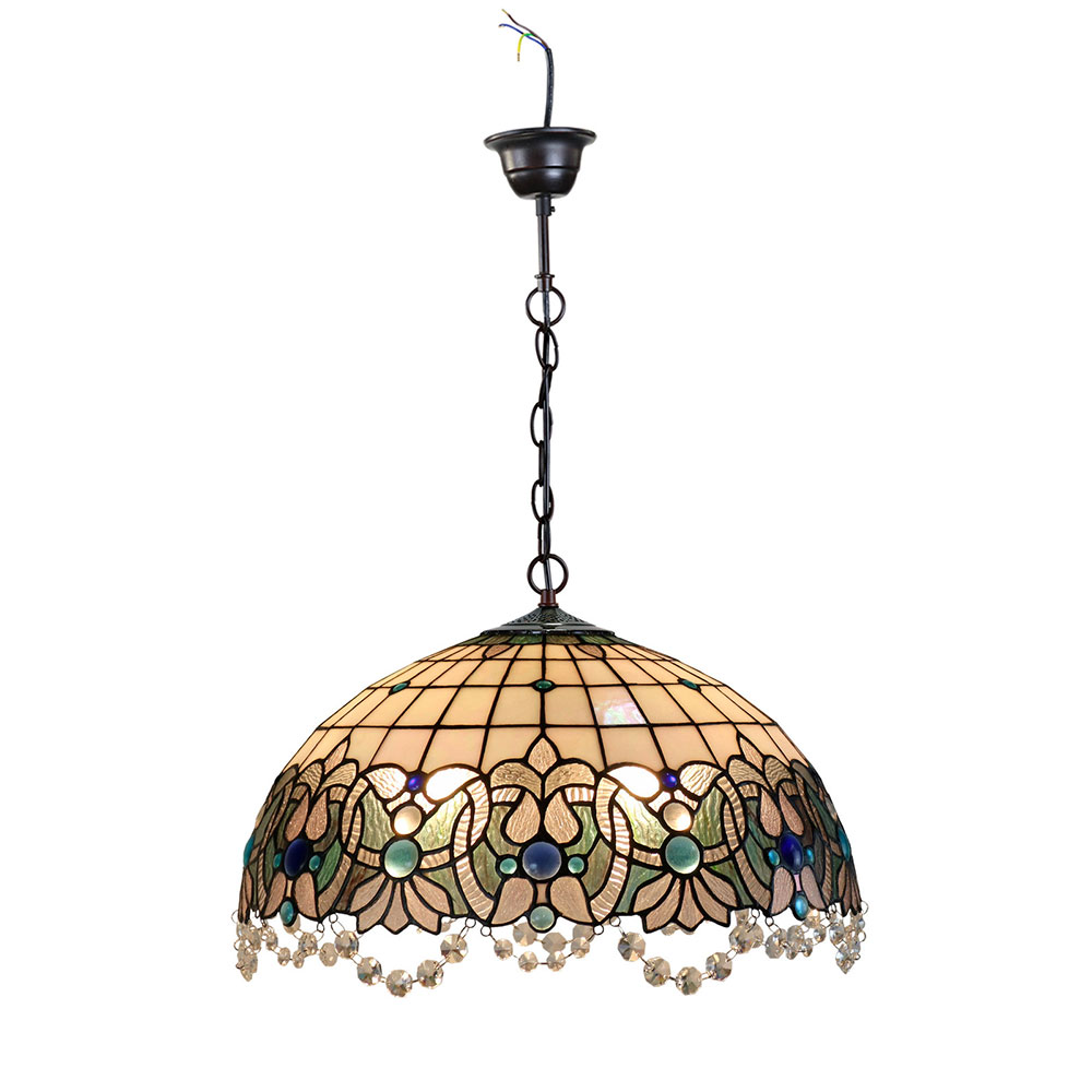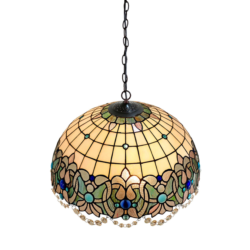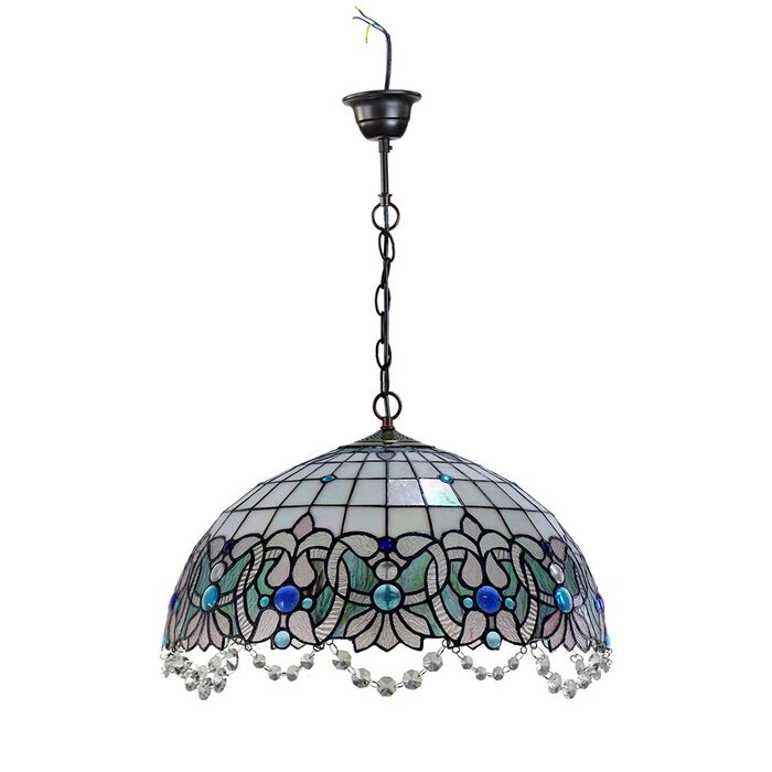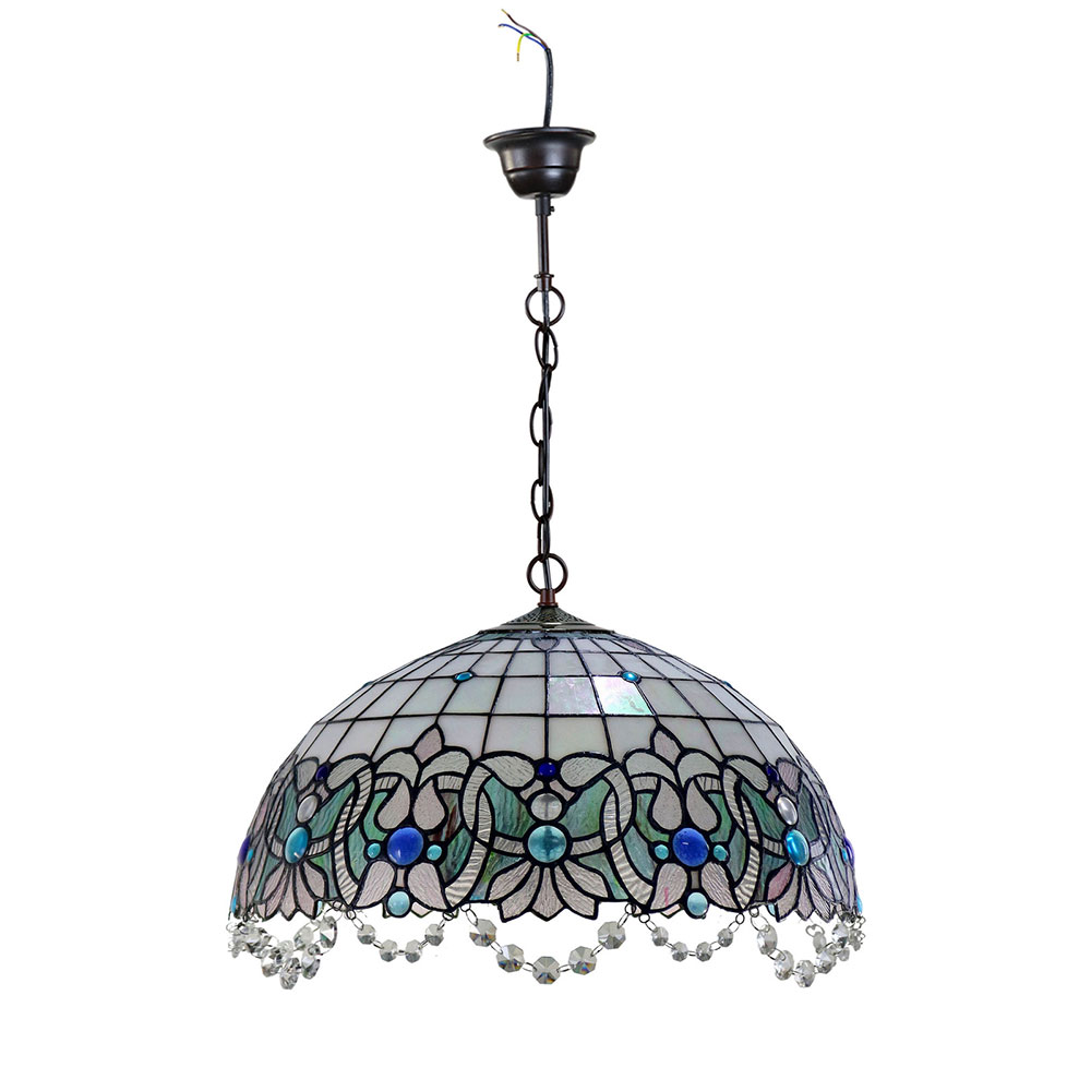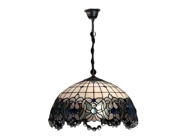 Introducing the Tiffany Shelby Stained Glass Pendant Light with its stunning light teal stained art glass shade, coupled with hanging silver beads, creates a striking contrast.