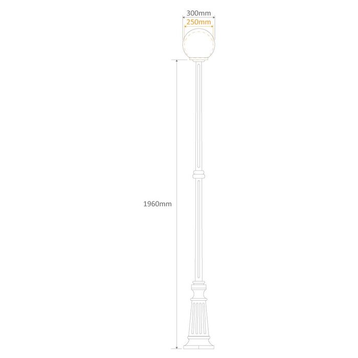 Siena 1 light 2.26m post light, die-cast aluminium body complete with 300mm opal acrylic sphere. Made in Italy, assembled and powder coated in Australia.