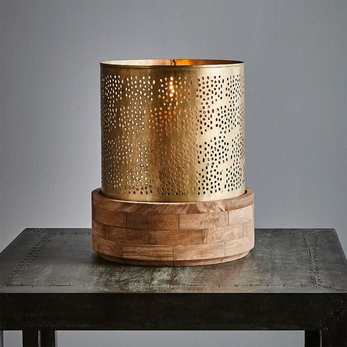 A filigree brass shade on a mango wood base, available in two sizes.