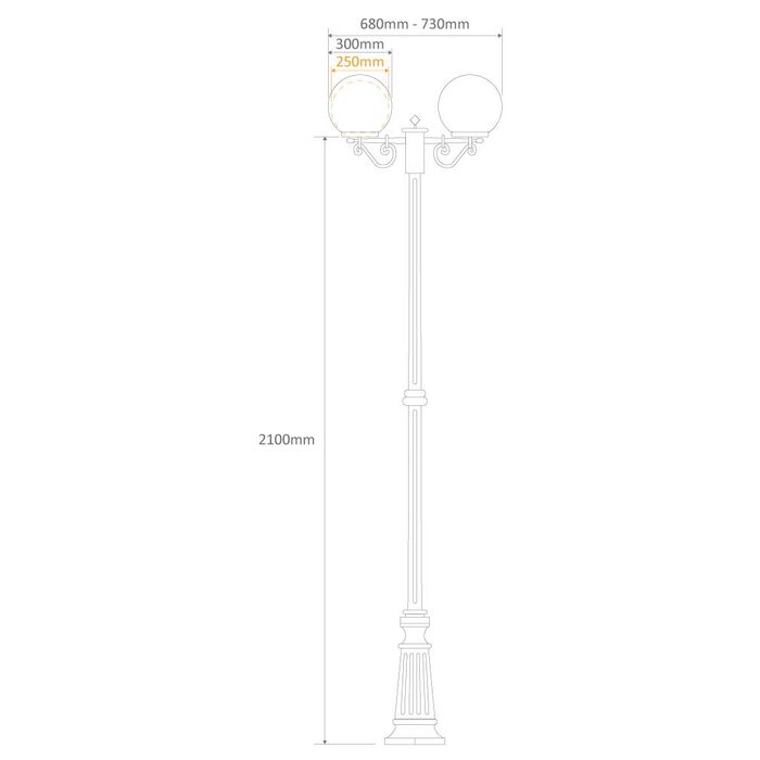 Siena 2 light 2.35m post lights, die-cast aluminium body complete with 250mm opal acrylic sphere. Made in Italy, assembled and powder coated in Australia.