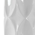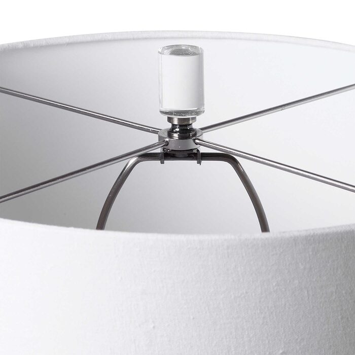 This ceramic table lamp showcases a touch of mid-century style with a dimensional geometric design finished in a glossy white glaze, accented with brushed nickel neck and a crystal finial.