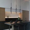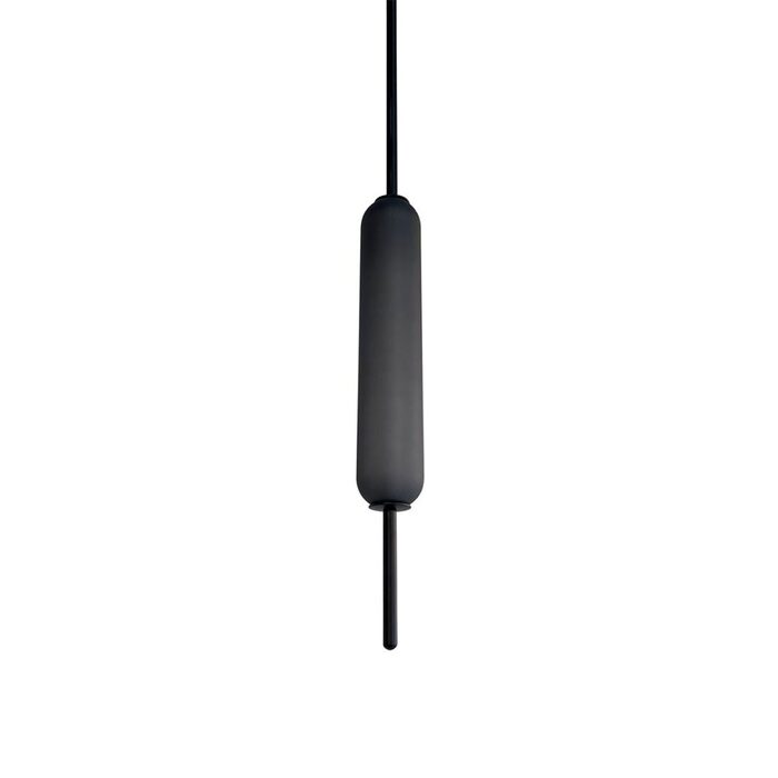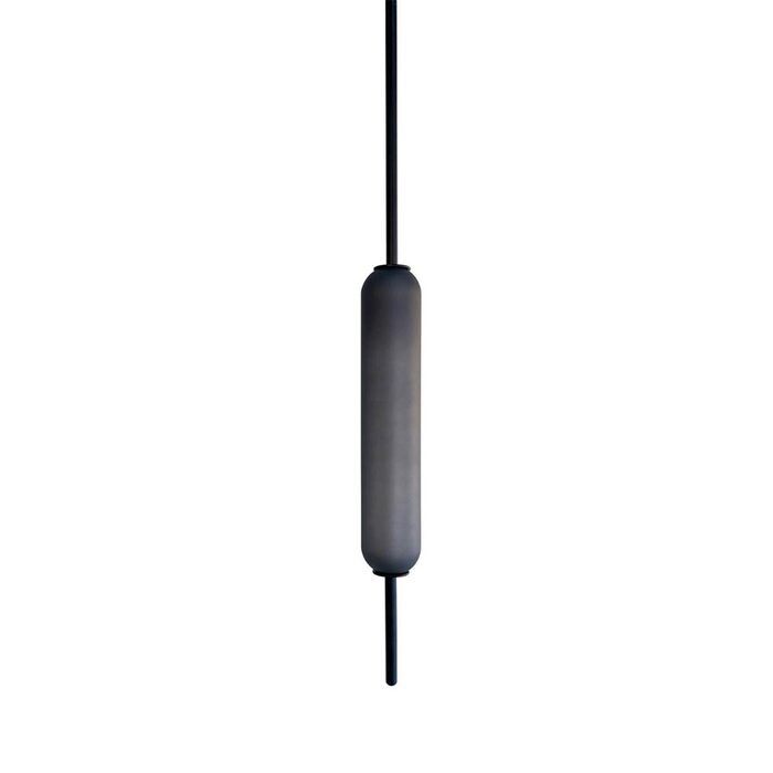 Soho has the shape of an upside-down cattail. A brass stem holds a LED light, itself enclosed by a tubular smoke glass shade.