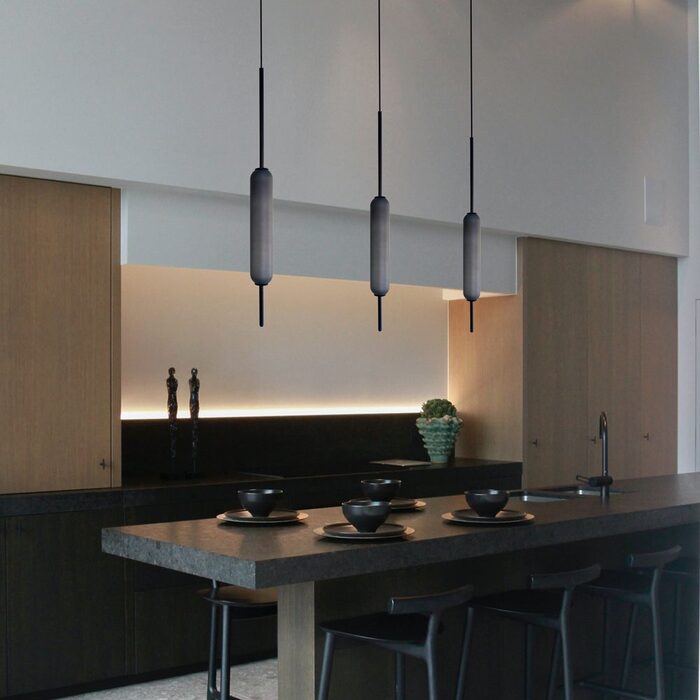 Directly inspired by the broadleaf cattail, or typha latifolia in Latin, this plant often found on the border of ponds, the hanging lamp brings a soft light to nay interior.