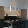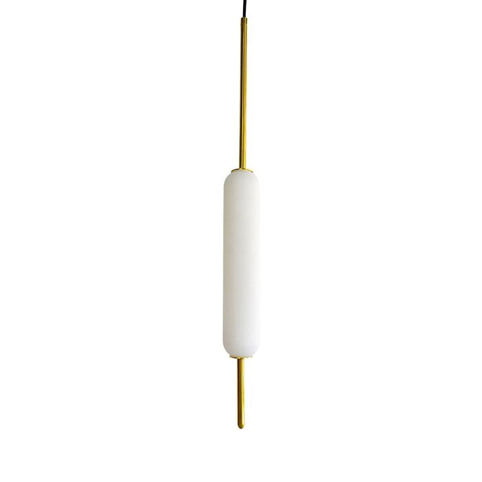 Soho has the shape of an upside-down cattail. A brass stem holds a LED light, itself enclosed by a tubular white glass shade.