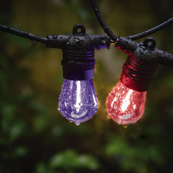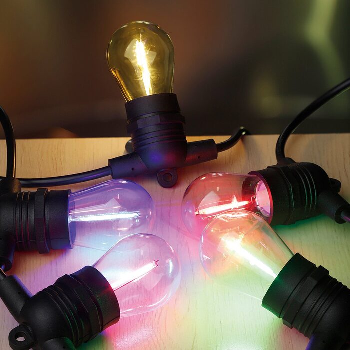 Festoon lights indoor or outdoors string comes with 10 x LED 1W coloured light bulbs.
