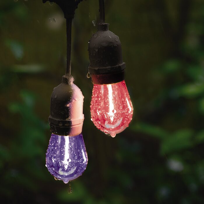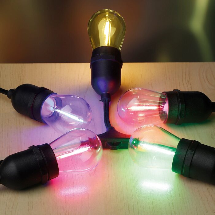 Festoon lights indoor or outdoors string comes with 10 x LED 1W coloured light bulbs.