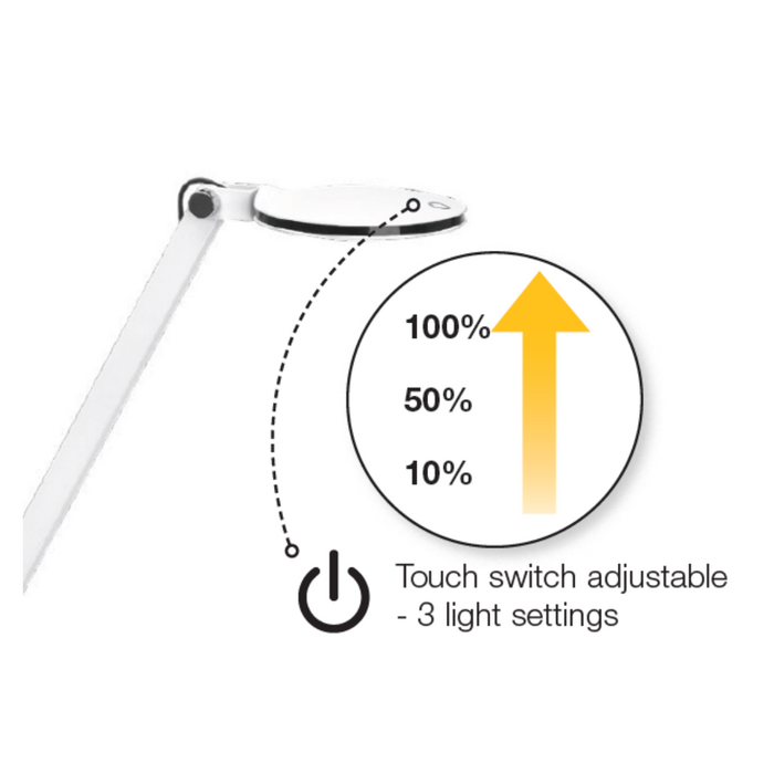 Touch switch dimmable to three light levels - 10%, 50% and 100%. 1500 Lux at 500mm distance, 13000 Lux at 150mm distance.