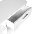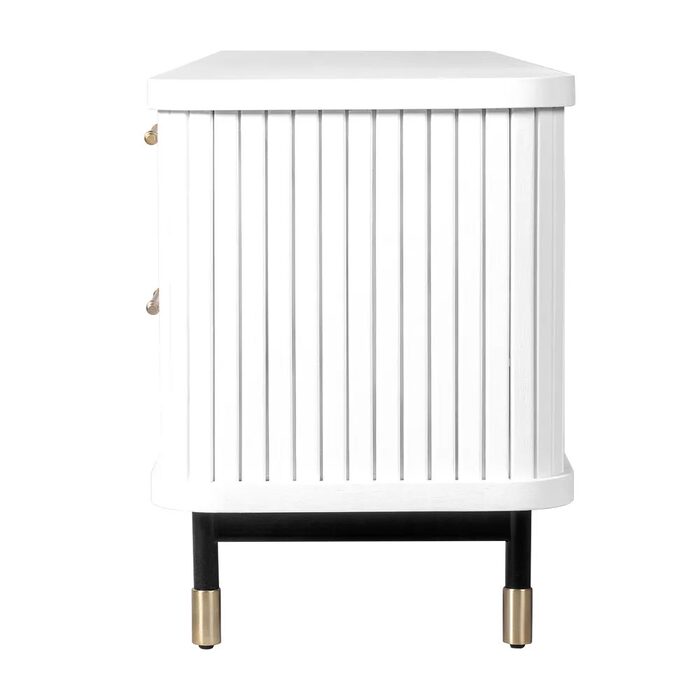 Featuring fluted drawer fronts, slim gold handles, and brass-capped legs, it introduces a fresh architectural elegance.