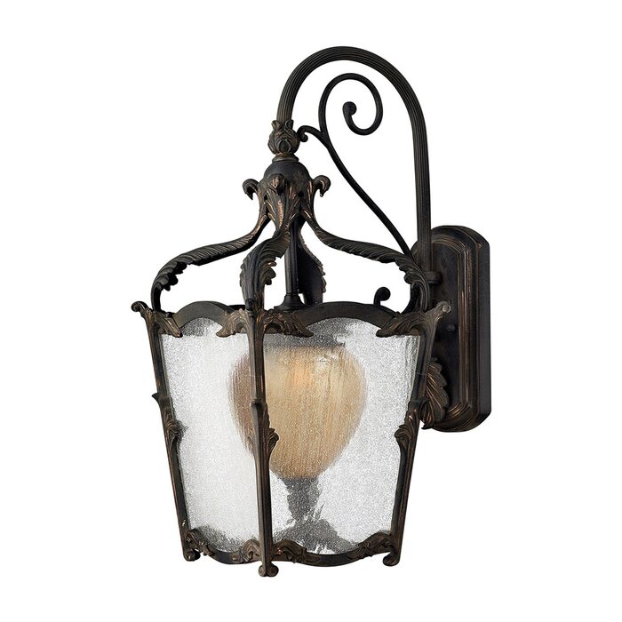 This outdoor wall light features an aged iron finish and clear seedy glass.