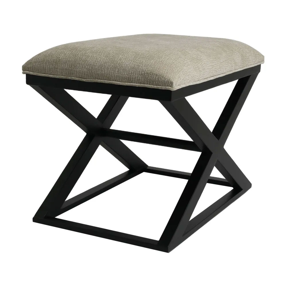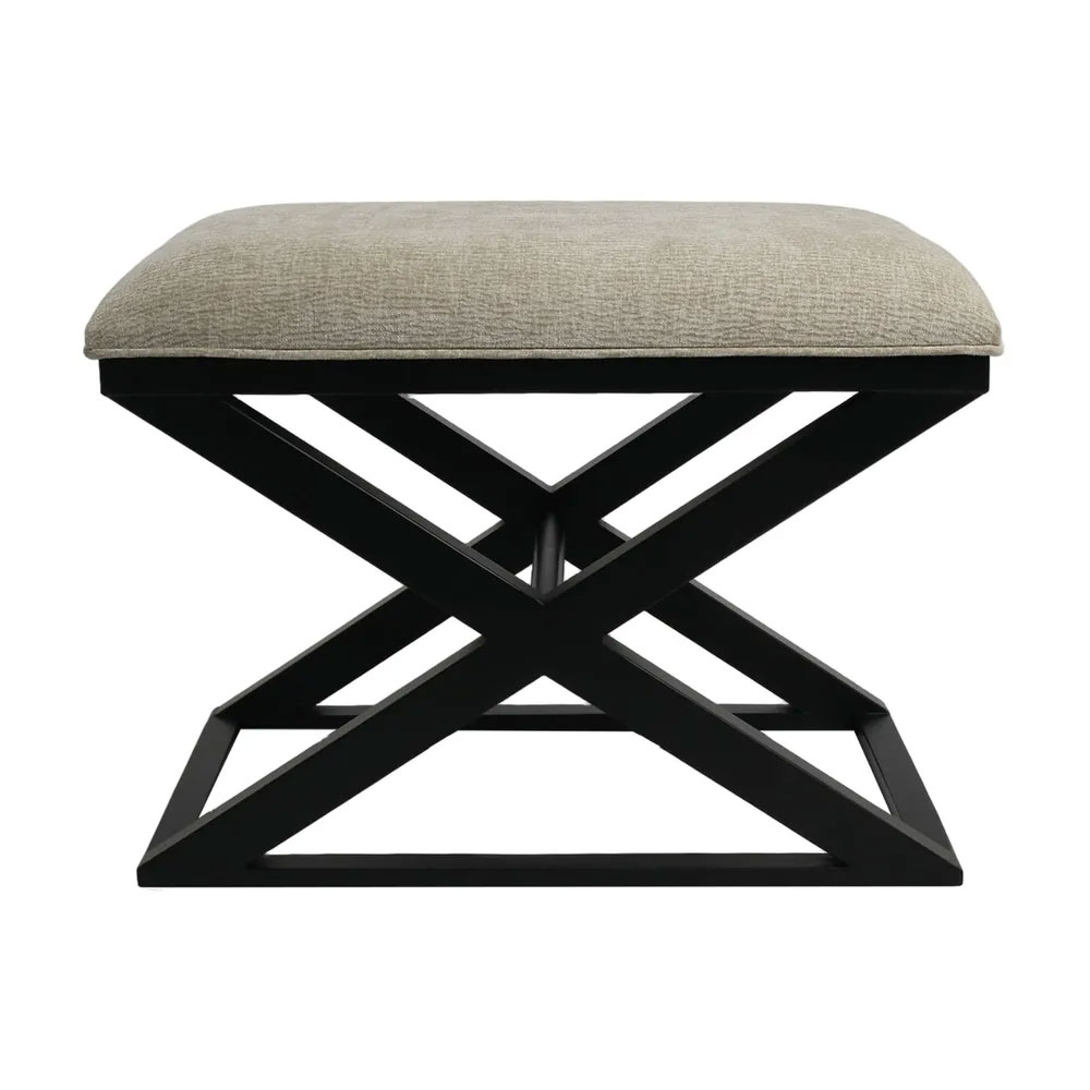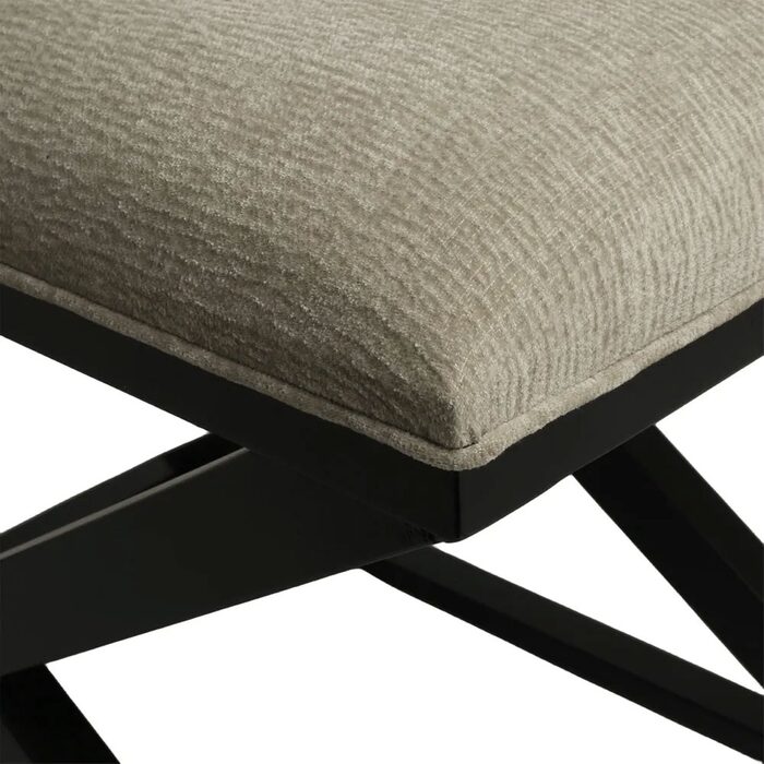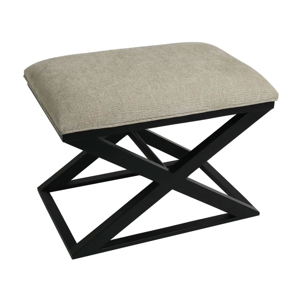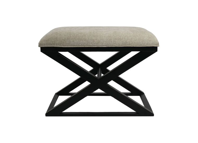 Featuring a classic cross-legged timber frame in a smooth black finish, it’s topped with a generously cushioned seat upholstered in a durable wheat-toned fabric.