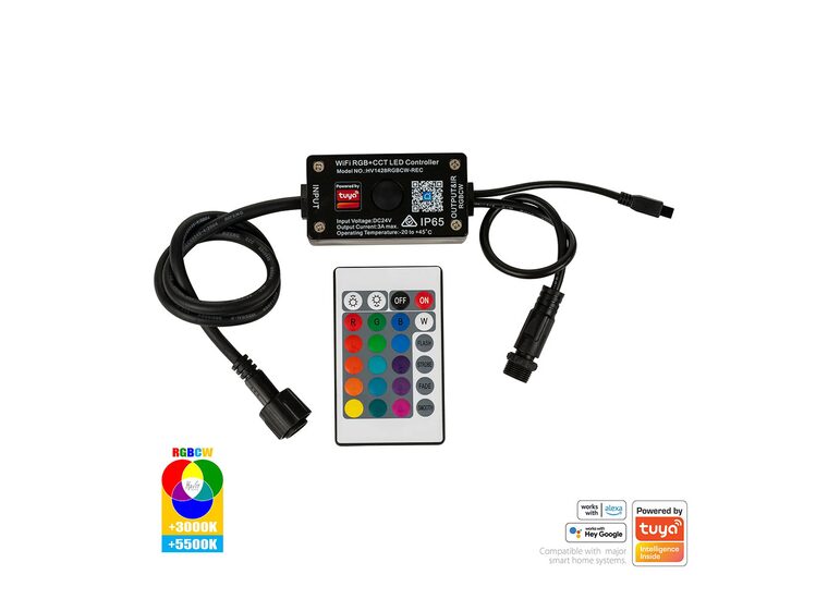 The HV1428RGBCW-REC is a Havit Lighting Wi-Fi Receiver and IR Remote designed for their Spitze RGBCW (Red, Green, Blue, Cool White, Warm White)