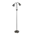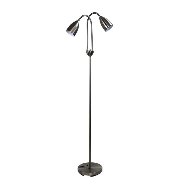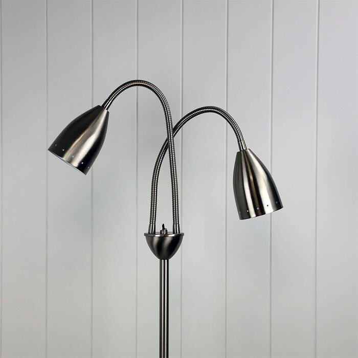 STAN is a mid-century styled twin floor lamp featuring flexible goose-neck arms with metal shades.