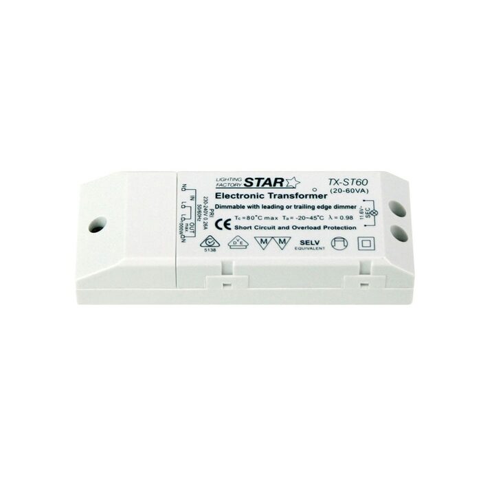 Electronic 60va (watts) transformer. Designed for use with 12v halogen globes (not with LED globes). Suitable for dimming.