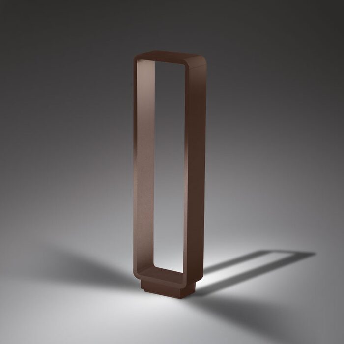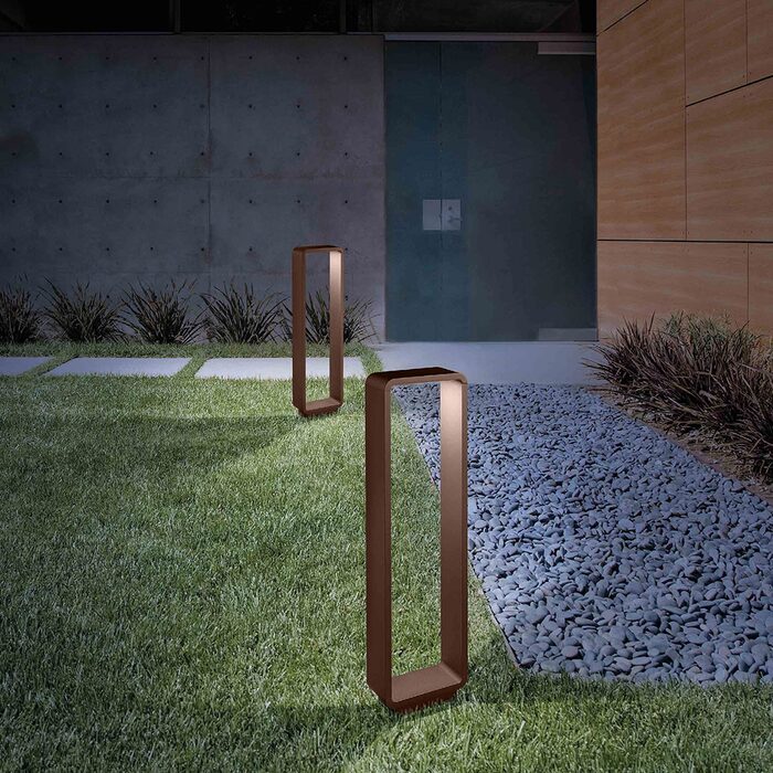 A collection of bollard light with a matte white, dark grey or corten painted aluminium fixture, a polycarbonate diffuser and a LED light source.