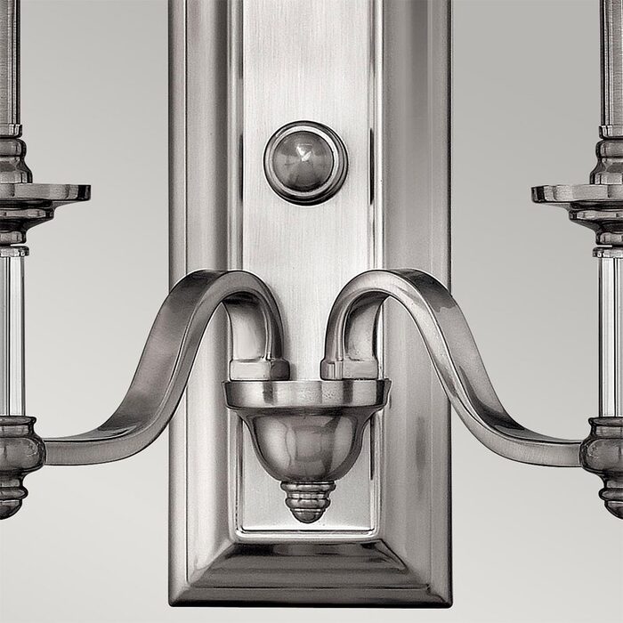 The Brushed Nickel finish, white fabric hard back shade and clear glass column and candles adds to its sophistication.