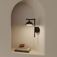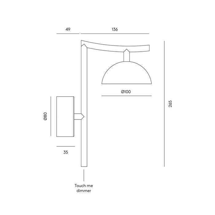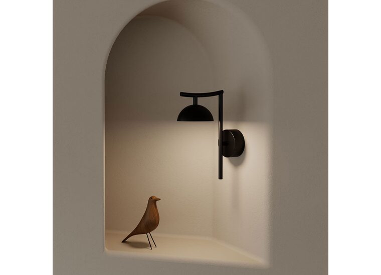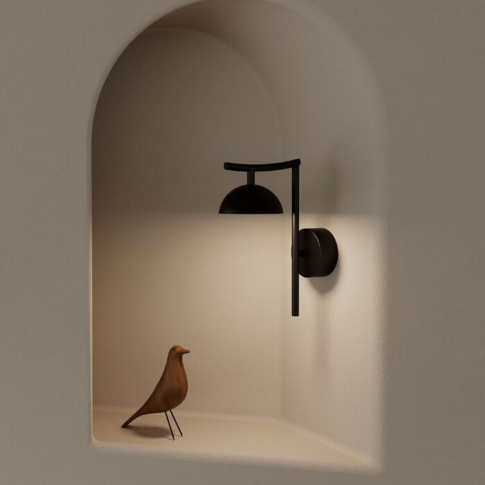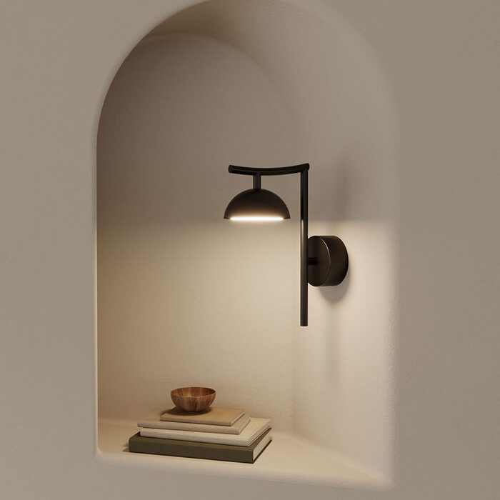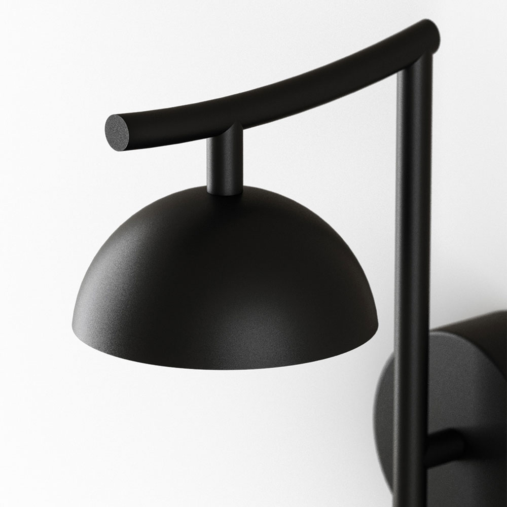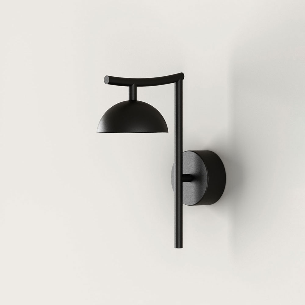 Tana Wall Light by Aromas Del Campo features a compact dome shade which sits below a subtly curved steel arm and sleek backplate.