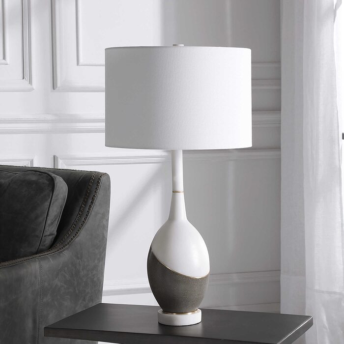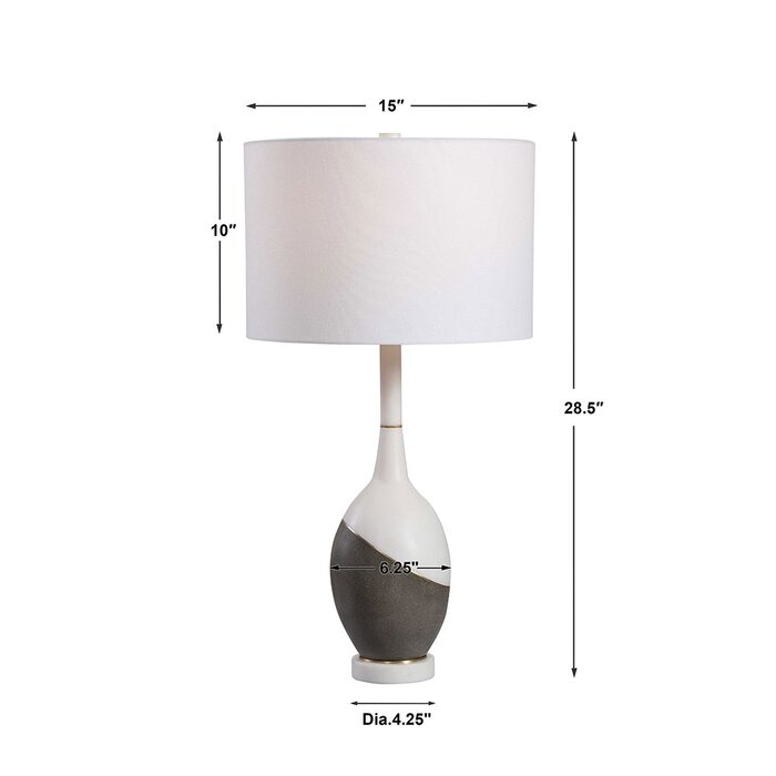 Simple yet sophisticated, this table lamp features a combination of honed charcoal concrete and a polished white marble look, accented by brushed gold plated accents.