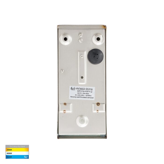 The Havit HV3605T-SS316 Taper is a durable 316 marine-grade stainless steel, 12V DC LED wedge wall light featuring a tri-colour selectable 5W MR16 globe (3000K-5500K) and frosted tempered glass.