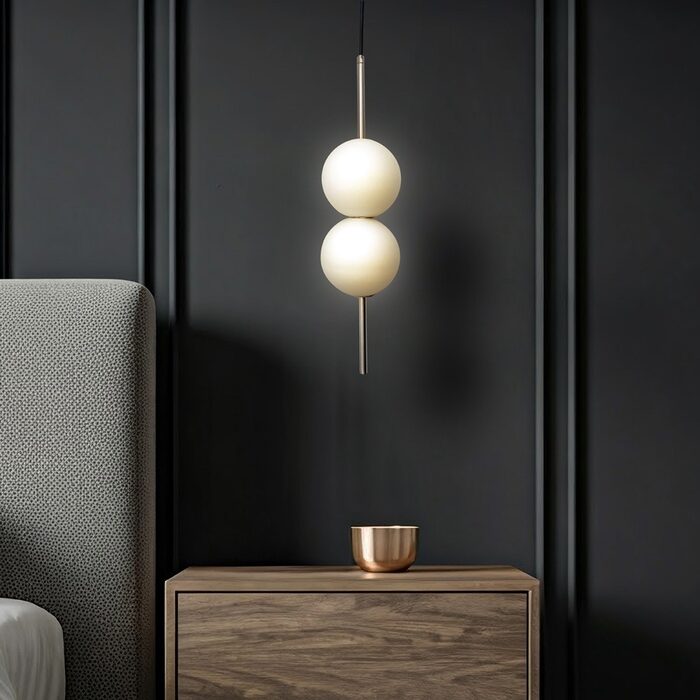 The opal matte finish of the shades prevents glare and the striking black embellishments add drama and warmth, making it a statement piece in any space.
