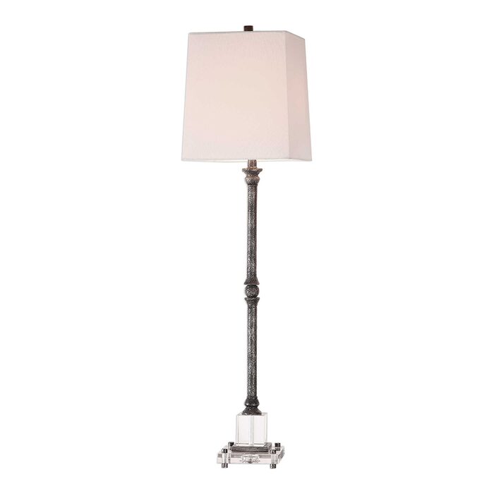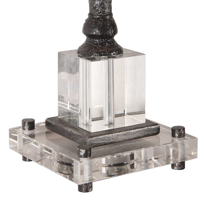 This updated look on a classic design features a decorative column, finished in a heavily textured aged black with subtle silver highlights, displayed on a thick crystal foot.